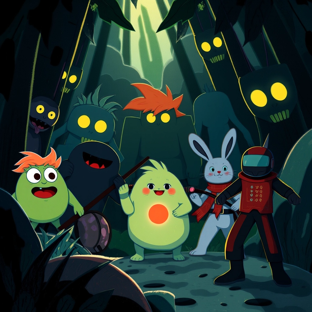 ‘Someone else is looking for the crystals,’ whispered [Fluffo](62CZ6GP5) as shadows moved within the trees. Strange black creatures with glowing eyes watched them but didn’t attack. ‘What are they?’ [Piney](LMQYJ75V) gulped. [Red](SHX7T34T) stepped forward, his glowing heart pulsing faintly as if he recognized them.