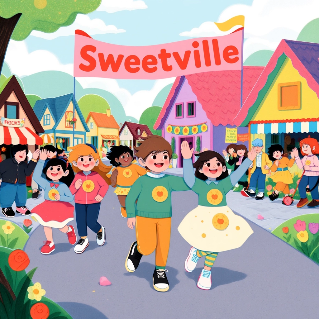 That evening, they returned to Sweetville and shared their honeycomb badges with everyone, becoming heroes of the town.