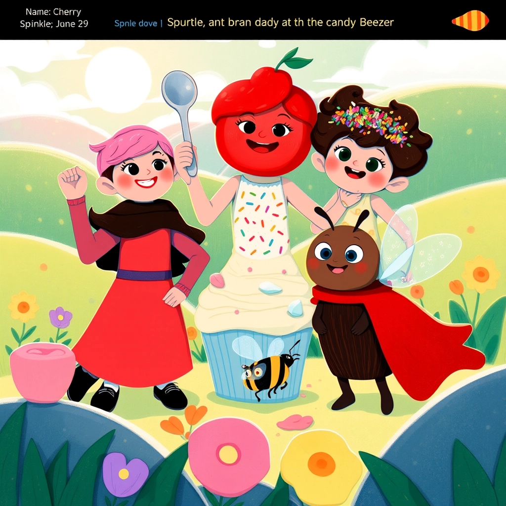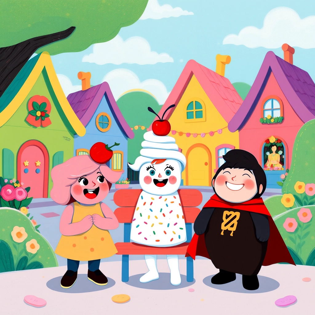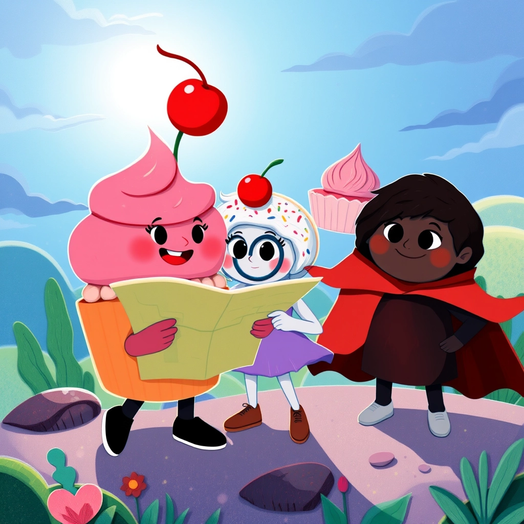 Once upon a time, in Sweetville, there was a cheerful trio called the Cupcake Kids: [Cherry](K5PLF2PT), [Sprinkle](2PNRPBQN), and [Coco](G5X2RJDZ). [Cherry](K5PLF2PT) had a bright red cherry on her head, [Sprinkle](2PNRPBQN) sparkled with rainbow sprinkles, and [Coco](G5X2RJDZ) had a swirl of chocolate frosting.