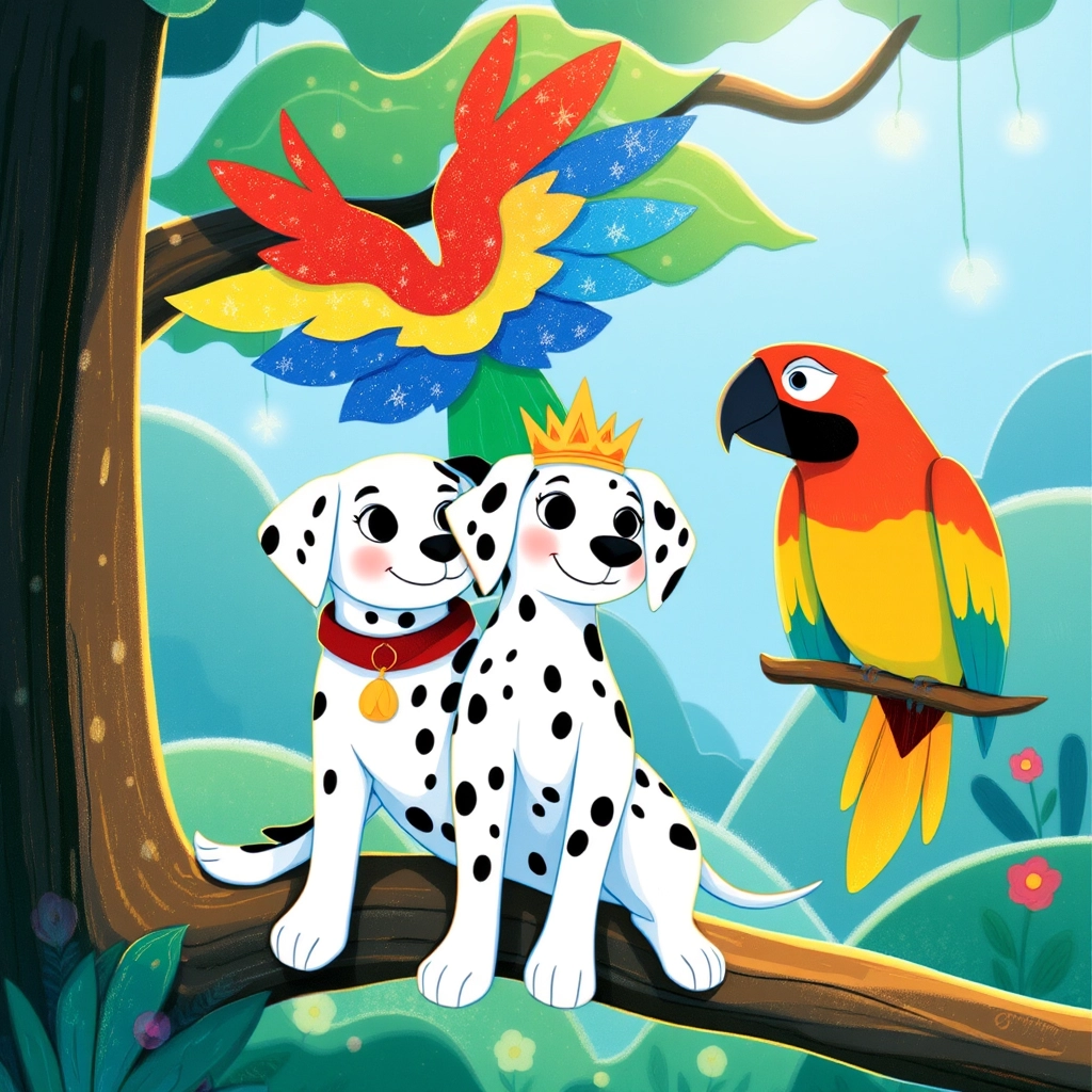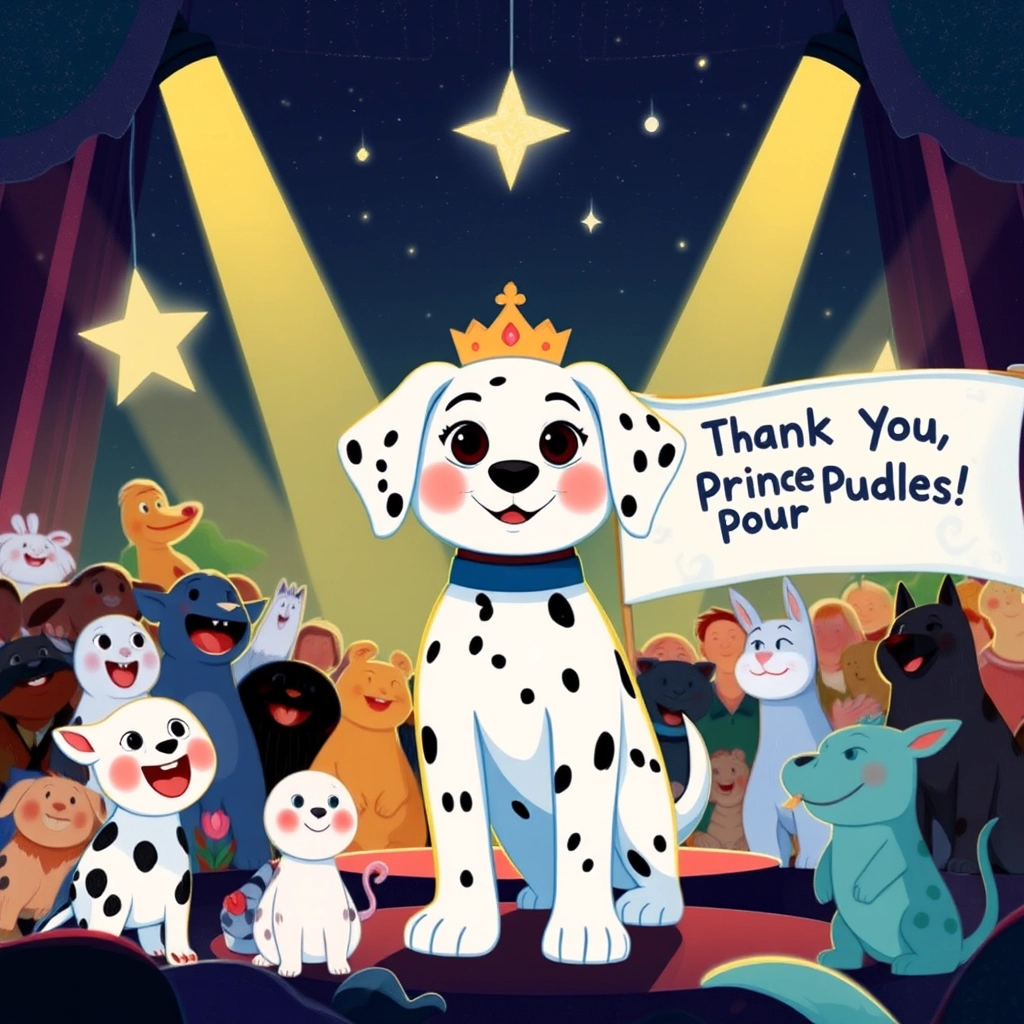 In a faraway kingdom, where the grass sparkled with dew like diamonds and the skies were painted in hues of endless blue, lived [Prince Puddles](NYGZNGK2), a very special Dalmatian puppy. Unlike any other pup, [Prince Puddles](NYGZNGK2) could talk, and his heart was even bigger than his adorable black-spotted ears!