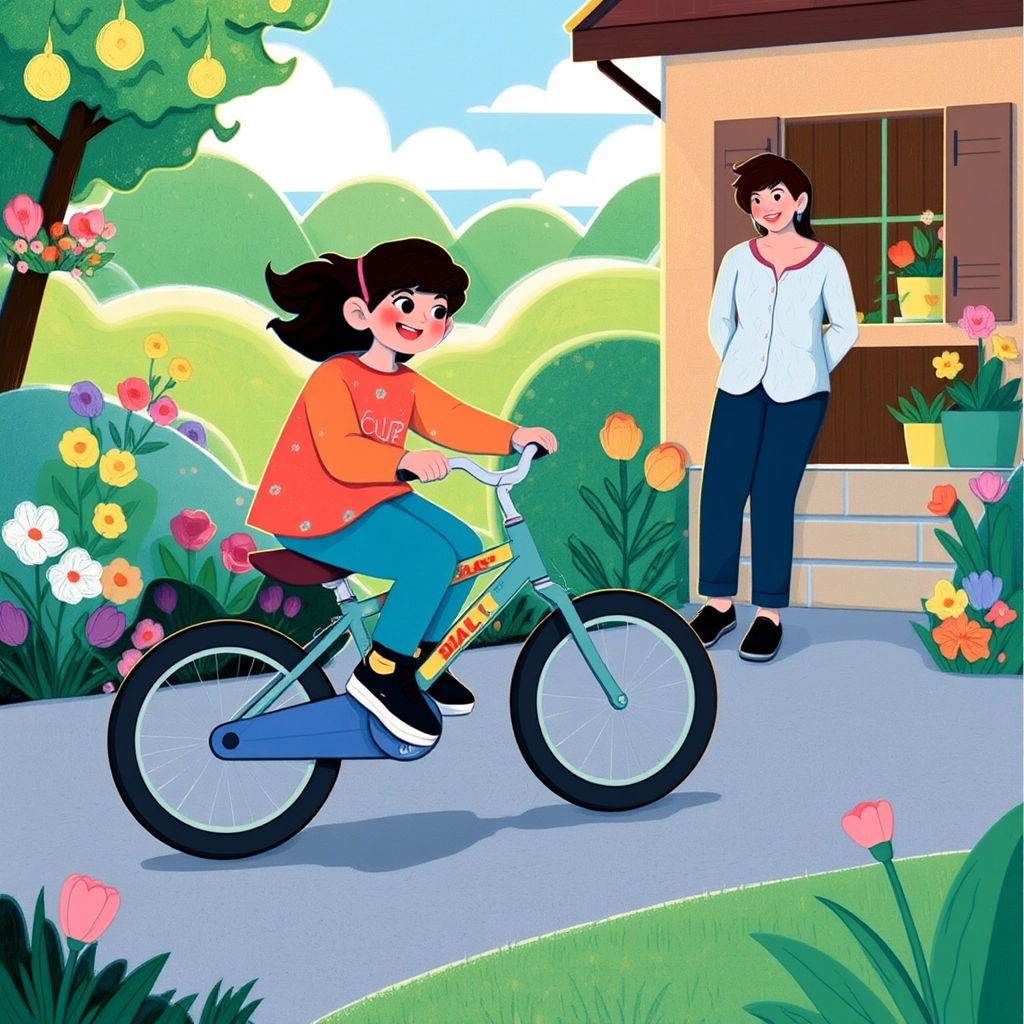 In the driveway, she lined up the bike. Her hands gripped the handles tight. 'This is it! I’m ready now!' she thought. Her heart raced as her mother watched, silently giving her support.