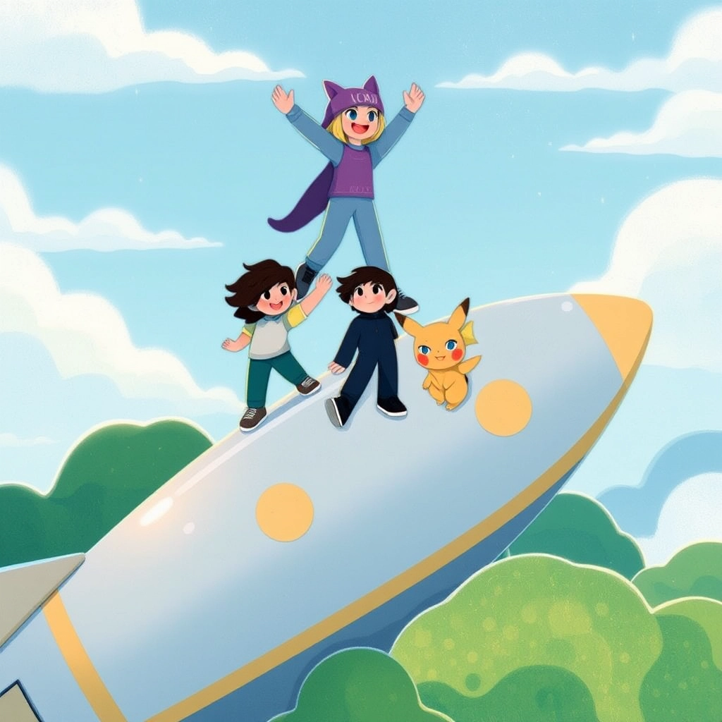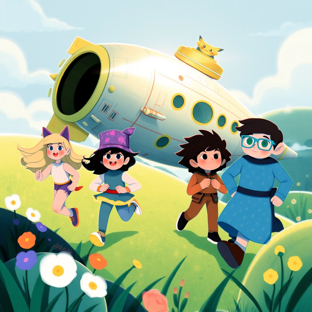 "Let’s slide down!" [Tater Tot](4GQJ4WHK) said, showing the kids how to safely slide off the spaceship. They followed her, laughing as they slid down one after the other, landing in the soft grass at the bottom.