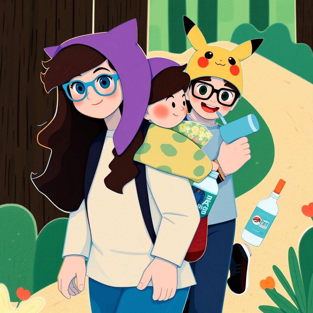 Once upon a time, [Beatrix](5765WXM6), a playful 3-year-old with long dark blonde hair and a purple cat hat, and her little brother [Elim](BPGKBLCL), with his messy curly brown hair and Pikachu hat, greeted their fun aunt, [Tater Tot](4GQJ4WHK), with delightful screams of excitement. Today was going to be a special adventure!