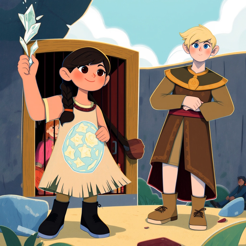 With a rock, [Mira](3V9WKJNP) smashed the crystal cage and freed [Theo](YF4GCSK2). But instead of a thank you, [Theo](YF4GCSK2) frowned and said, ‘Where’s your dress? What kind of princess wears a potato sack?’