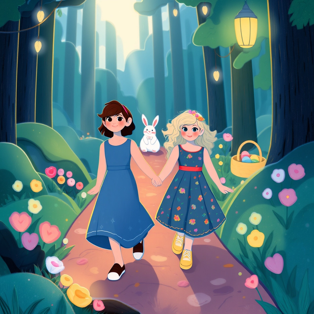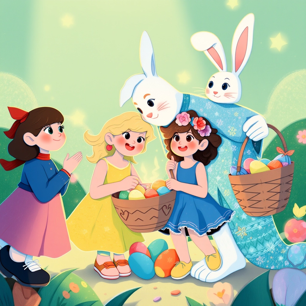 The sisters eagerly agreed. Soon, the Bunny handed them baskets of colorful eggs and explained, 'Hide these eggs around your town for children to find on Easter morning!'