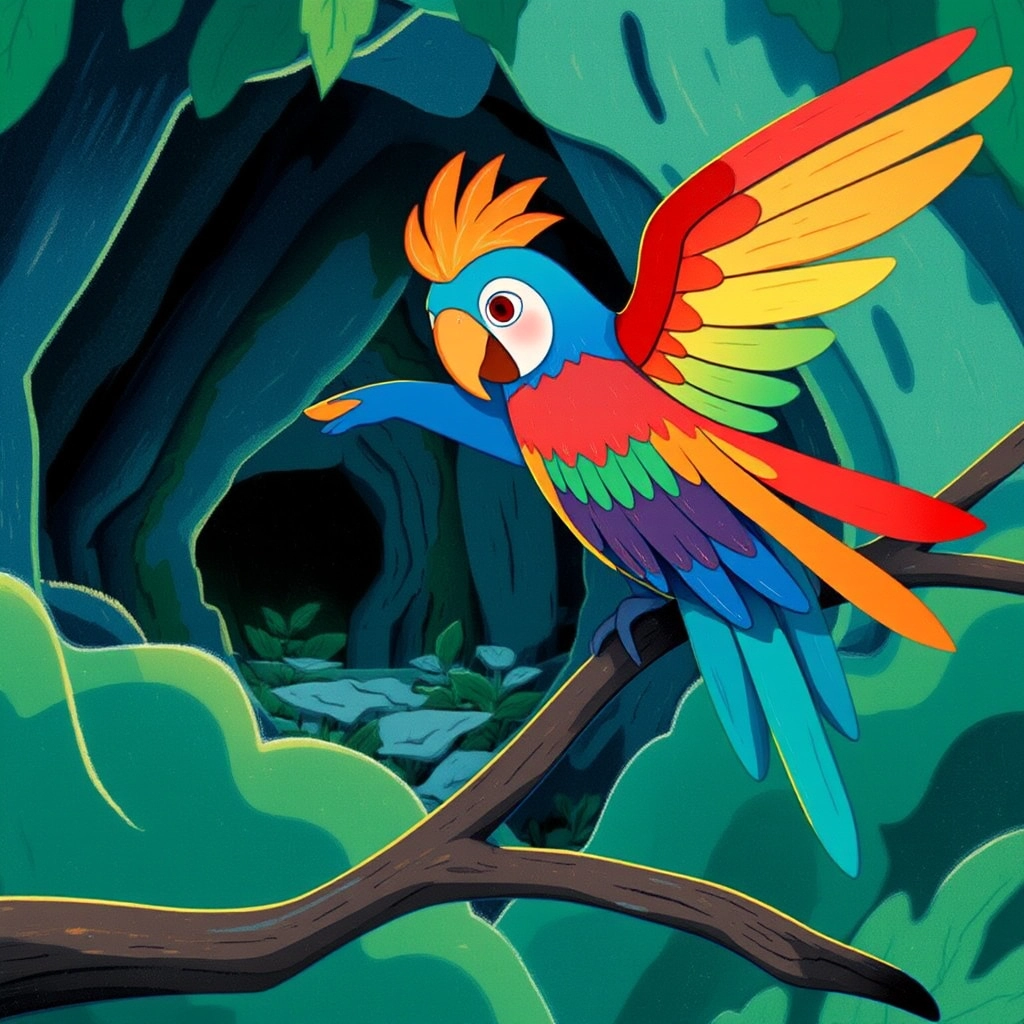 [Polly the Parrot](NG6KC39T) fluttered her rainbow-colored wings and perched on a branch above them. 'That’s not it,' she chirped. 'But I spotted a cave from up here! Let’s check it out!'