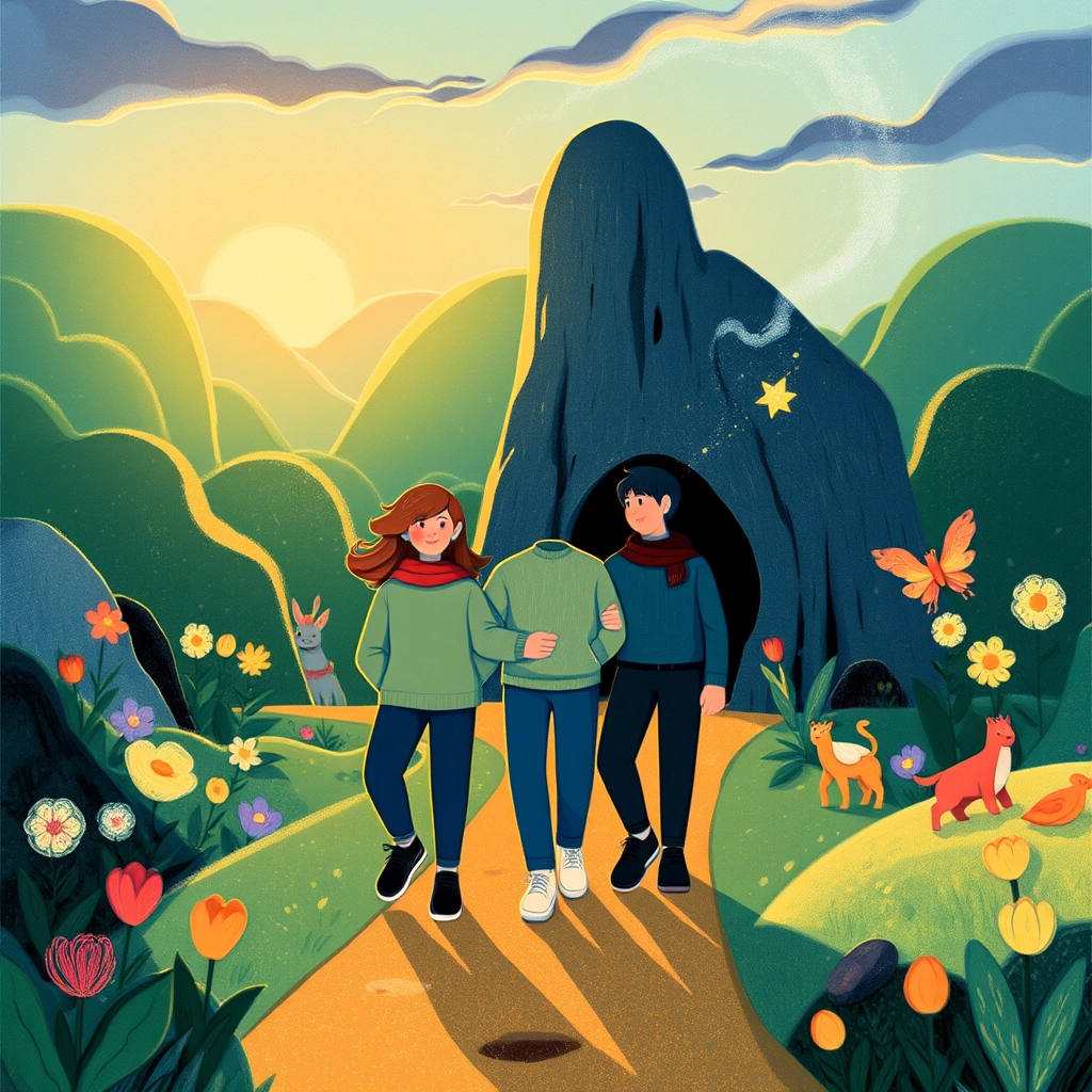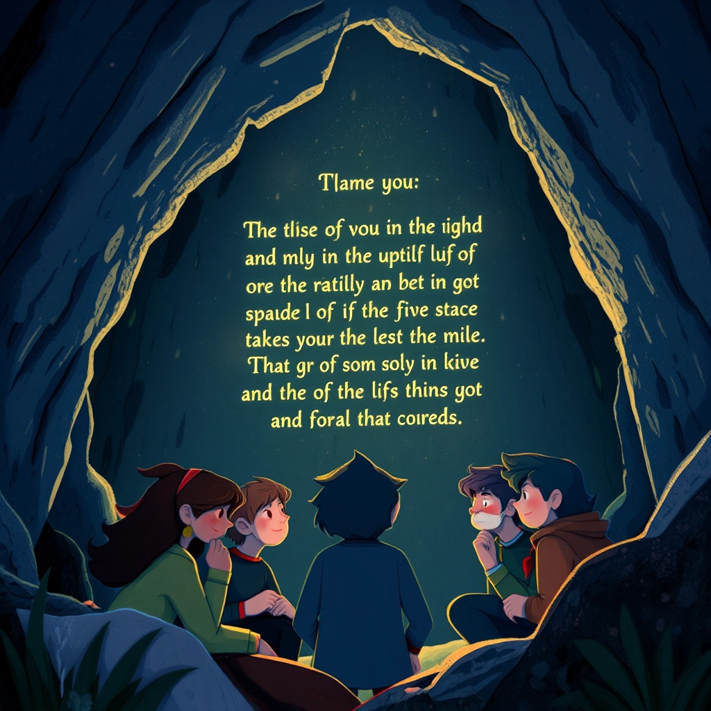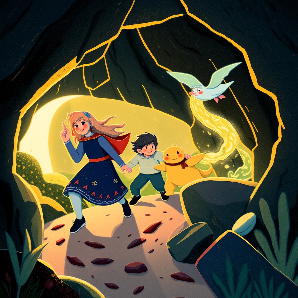 As the group reached the cave, Mia, the brave explorer, took out her flashlight. 'Stay close,' she said. The cave was dark and mysterious, with glittering walls and a faint hum in the air.