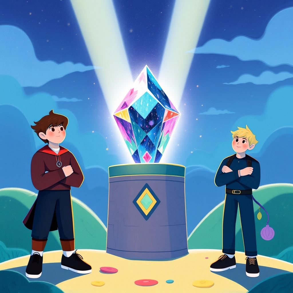 Finally, they found the Rainbow Gem sitting atop a pedestal. But just as they reached for it, a sparkling barrier appeared! 'Only those with true friendship may pass,' boomed a voice.