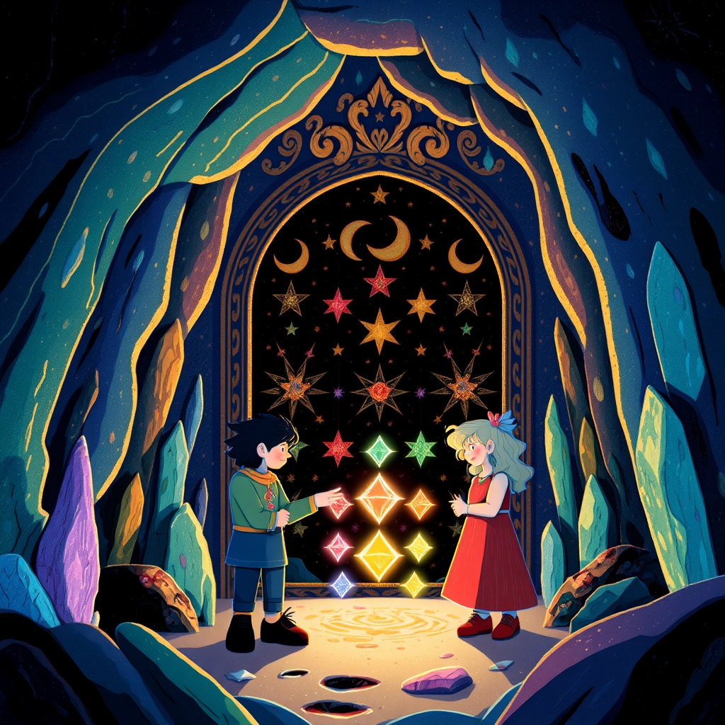 After the valley, they reached the Cave of Colors. Sparkling crystals lit up the dark cave, and Benny and Fiona worked together to solve a riddle to open the secret door.