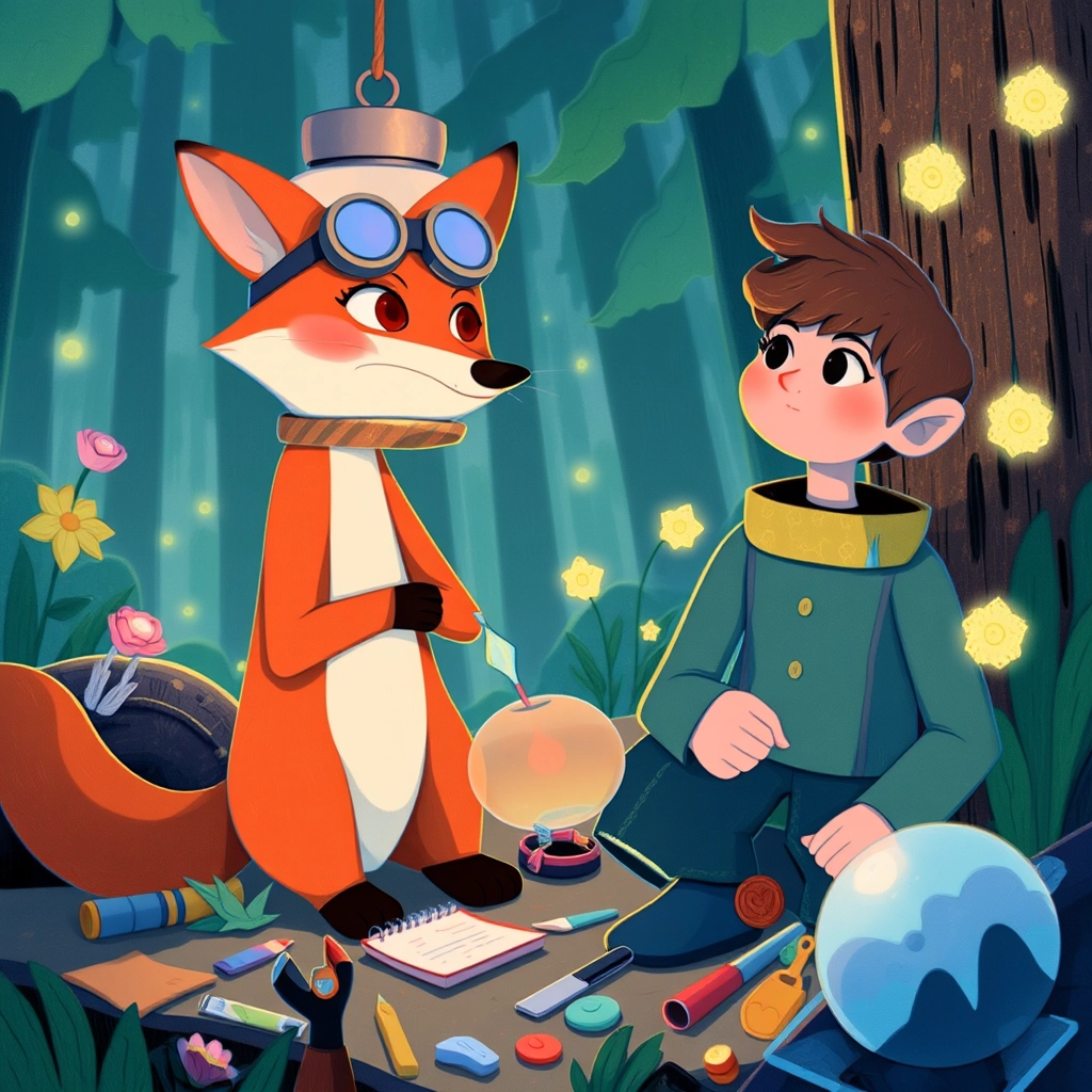 One sunny morning, Benny met a clever fox named Fiona, who was busy inventing a floating lantern. ‘Want to join me on an adventure to find the Bright Blossom?’ Fiona asked.