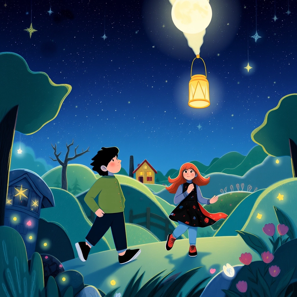 On their way back home, Benny and Fiona saw the floating lantern lighting up the night sky, guiding them back to their favorite treehouse.