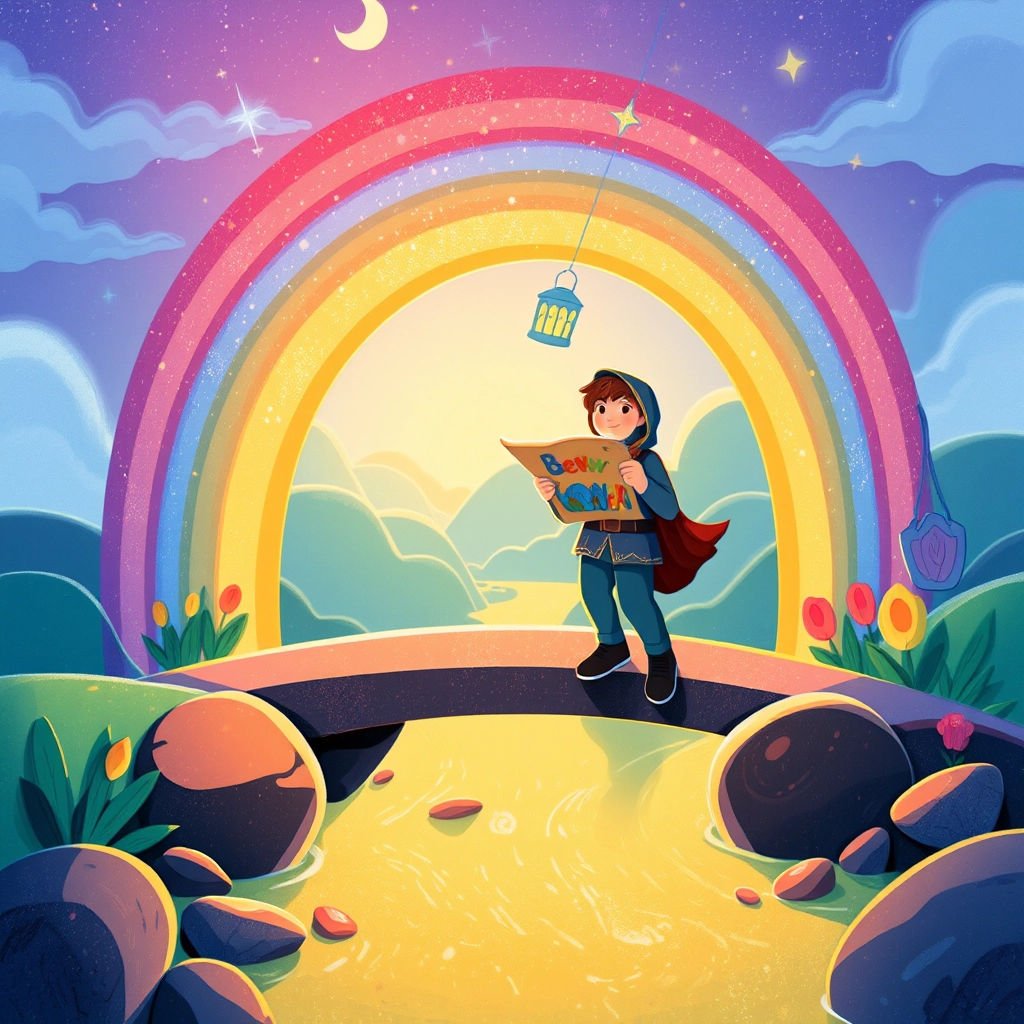 ‘The Bright Blossom grants wishes!’ Fiona explained. Benny’s eyes sparkled, and they set off on their quest, following an ancient map. The journey began with crossing the Rainbow Bridge.