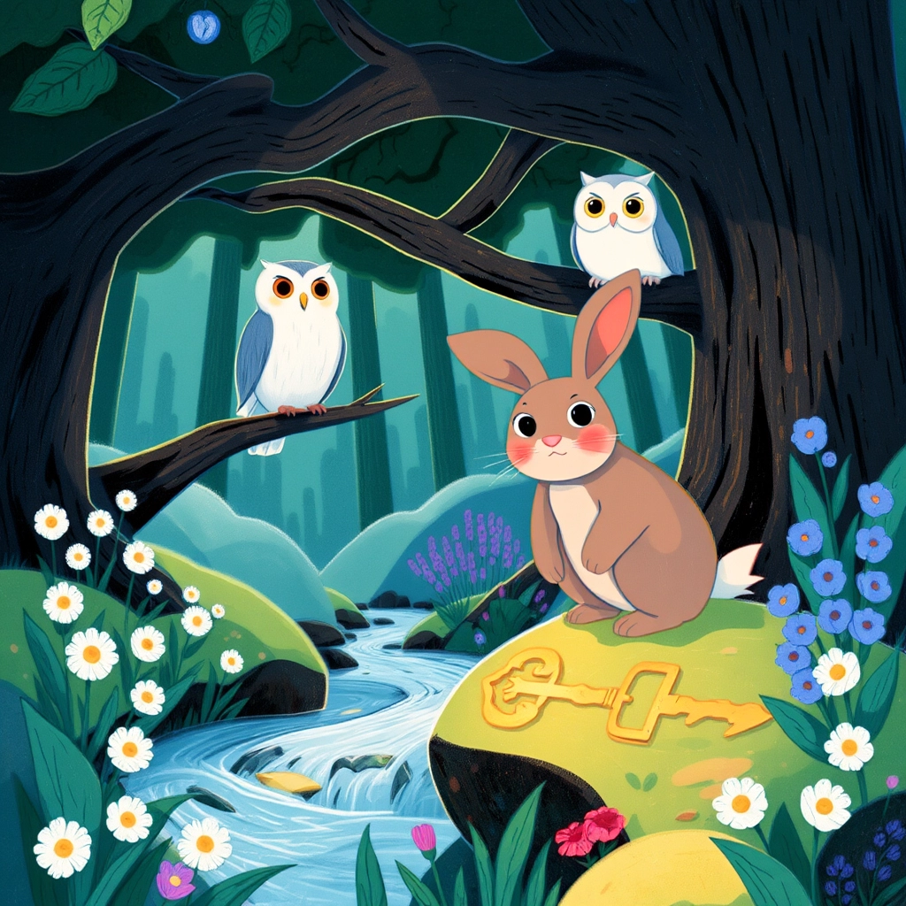 One sunny morning, [Benny](3Q3G55YB) found a peculiar golden key lying near a patch of wildflowers. He decided to ask his wise old friend, [Oliver Owl](JDYR43D5), about it. Oliver was perched in his favorite tree above a crystal-clear stream.