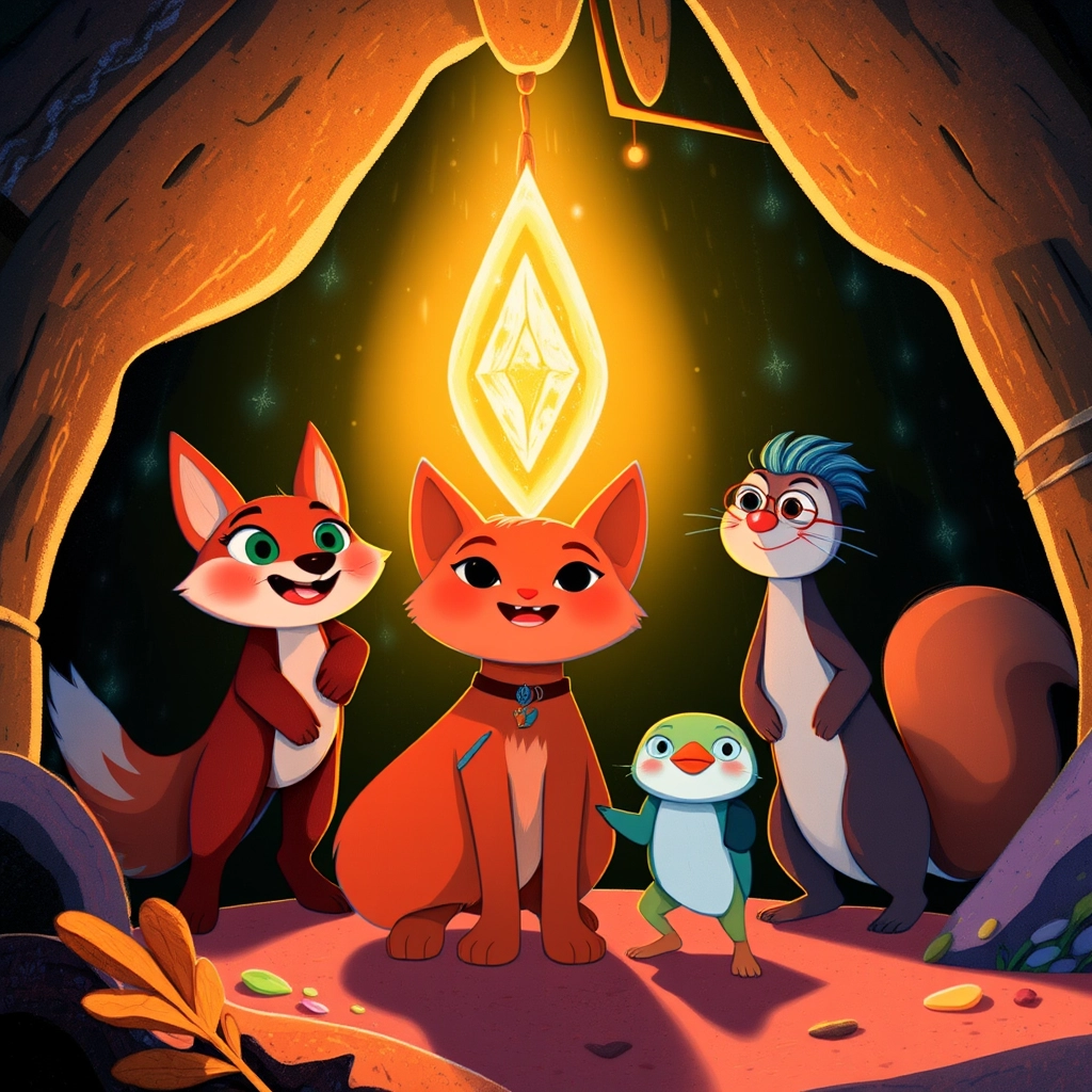 Suddenly, the room filled with light as their bond sparked a trail of glowing orbs leading deeper into the cave. Huddled close, they followed the trail with courage in their hearts.