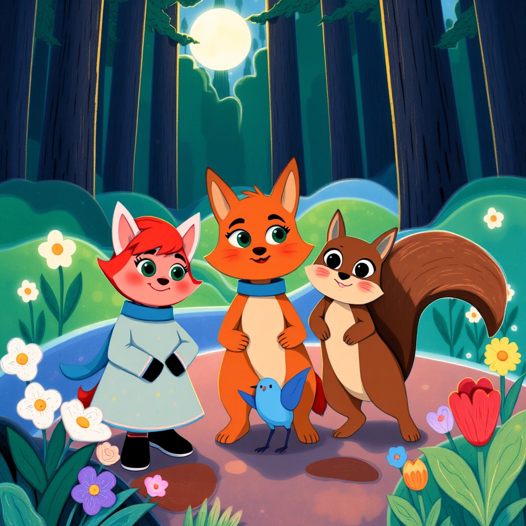Deeper into the forest, [Pip](9NNVKY2C) and [Clara](LLDC972H) came across [Rocky](BKK3BD44), a friendly squirrel with a bushy tail. 'The EverGem lies where the moonflowers bloom. I’ll show you the way!' [Rocky](BKK3BD44) exclaimed, flipping his tail excitedly.