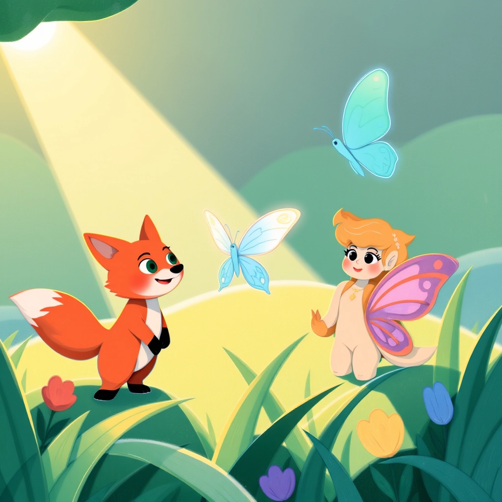 One sunny morning, her best friends, [Spark](B4SL7ZB4) the clever fox and [Lila](2Z4VNWFB) the joyful butterfly, told her about an ancient legend hidden in Aurora’s nearby enchanted cave.