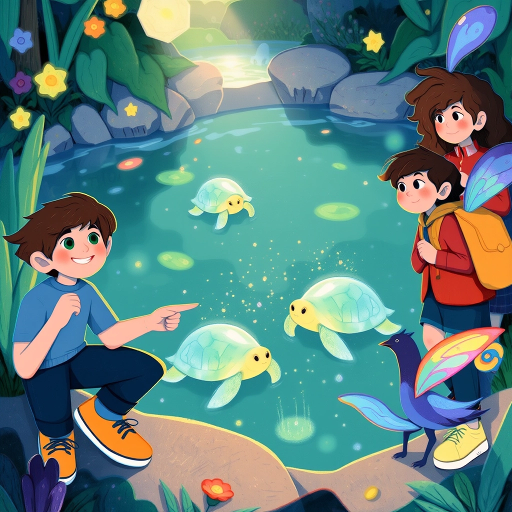 The first stop was the Pond of Reflection, where a family of shimmering crystal turtles swam gracefully. "These turtles teach us to pause and appreciate nature," said [Leonard](TB3BNMQ4). The children marveled at the turtles, their shells glinting like precious gemstones under the pond’s rippling water.