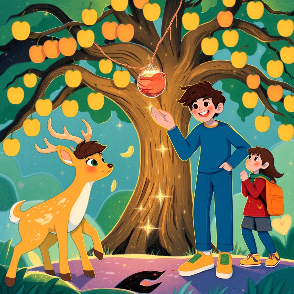 Next, they encountered [Florabella](PHJSD2KM) the golden deer, who guarded the Enchanted Tree of Kindness. "Only a kind heart can pluck the tree’s golden apples," she said. [Ben](TW5Z2WK4) and [Emory](BQTW9327) worked together to help a stuck baby bird, and to their amazement, the tree blossomed with shining apples.