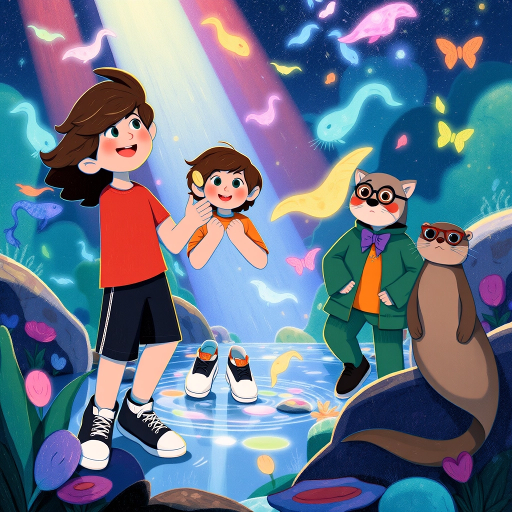 Their first stop was the pond of shimmering fish. 'These Spiritfish dance when they feel kindness,' [Oliver](DTMWJ2CJ) explained. [Ben](TW5Z2WK4) timidly tossed a crumb into the water, and the fish twirled joyfully, creating ripples of iridescent colors. 'See? Kindness creates beauty!' said [Oliver](DTMWJ2CJ).