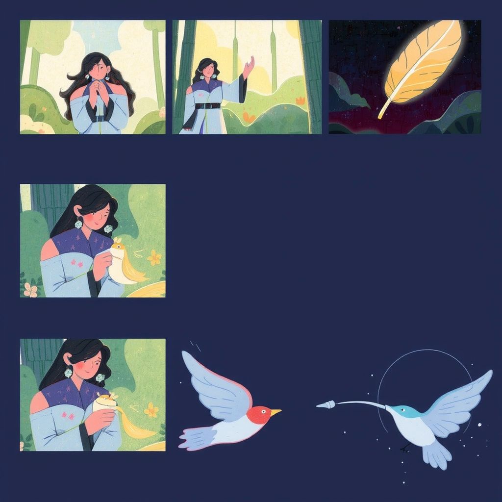 With delicate care, [Xia Zhi Yue](9RHDHVRC) nursed the bird back to health. As days passed, their bond grew stronger, and the bird's golden feather seemed to shine even brighter.
