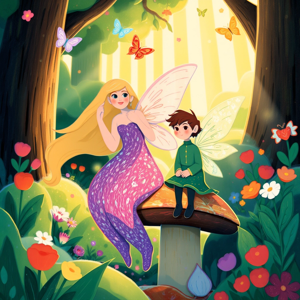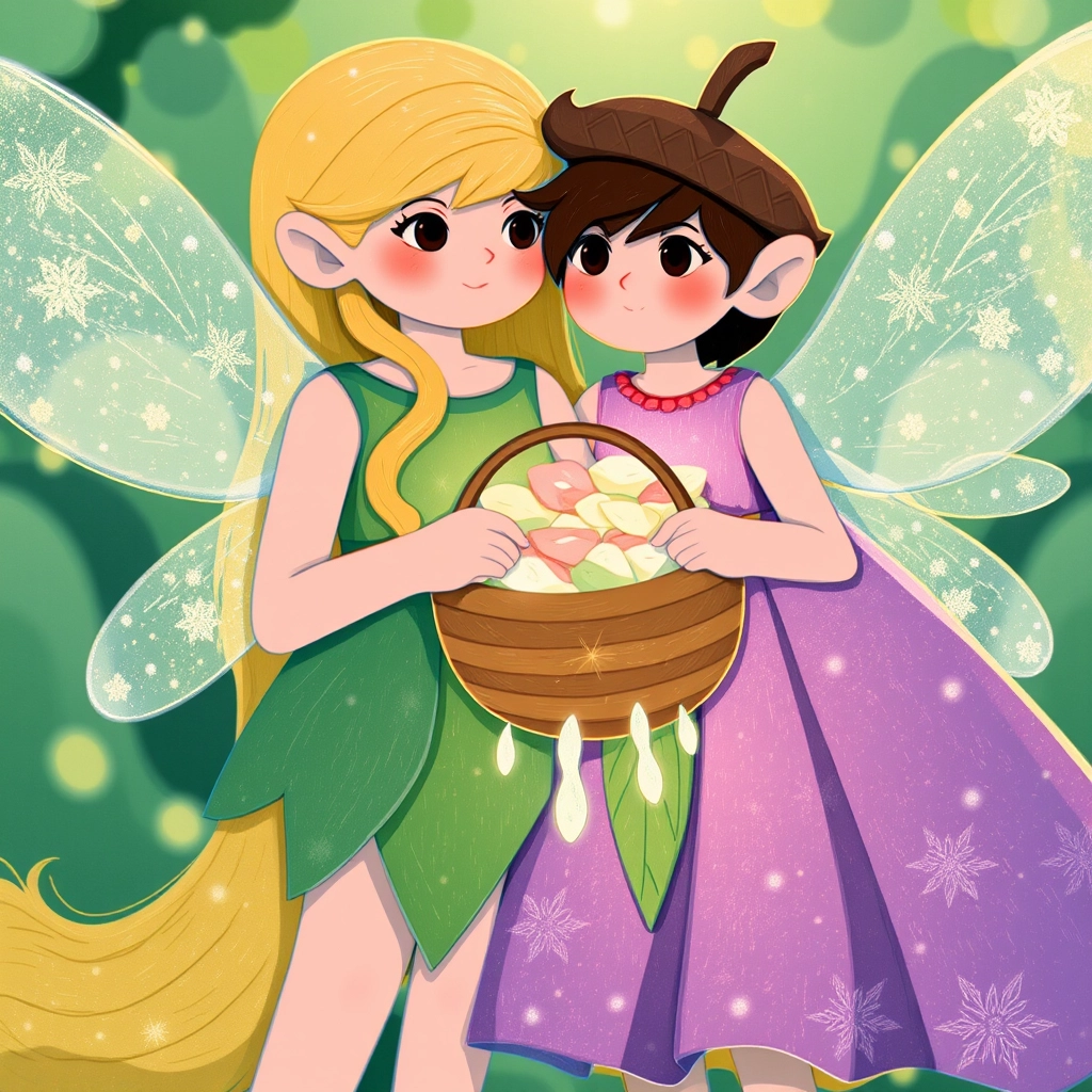 [Lila](XQG7N272), the thoughtful fairy, had long, golden hair that shimmered like the sun, and she carried a small basket for treasures, while [Pip](WGK23Q4R), her playful friend, had short, messy brown hair and a little hat made from an acorn.