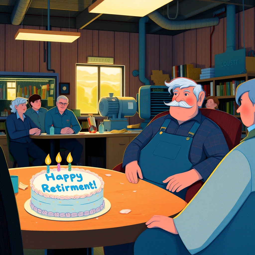 His boss, Mike, cleared his throat. 'After 35 years, we pay tribute to a man who’s… definitely made an impression.' Behind Mike, [Rodd](JKWQ7DTK)’s old toolbox tottered from the weight of a newly 'borrowed' solenoid. [Rodd](JKWQ7DTK)’s eyes twinkled under Mike’s glowing praise – he’d made off with both the small parts and the industrial motor he'd 'rescued.'