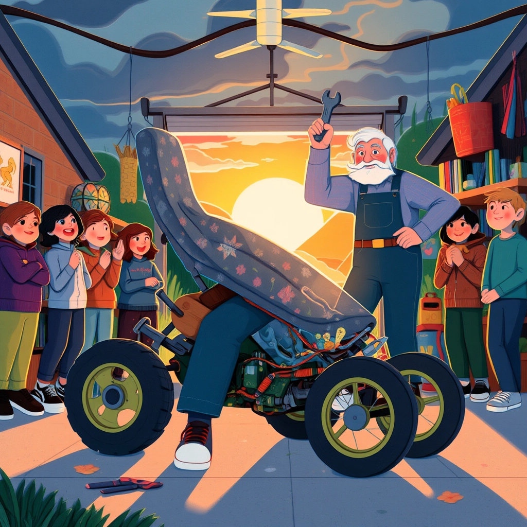 By the afternoon, [Penelope](YDM6Q9LH), [Maddox](YB272HL7), and [Lyra](B9CD2R5J) were in the garage, buzzing with excitement. 'So what are we building, Grandpa?' asked [Penelope](YDM6Q9LH), adjusting her glasses. 'Oh, just a little something called The Freedom Rider,' [Rodd](JKWQ7DTK) declared. They gasped as he unveiled the blueprints.
