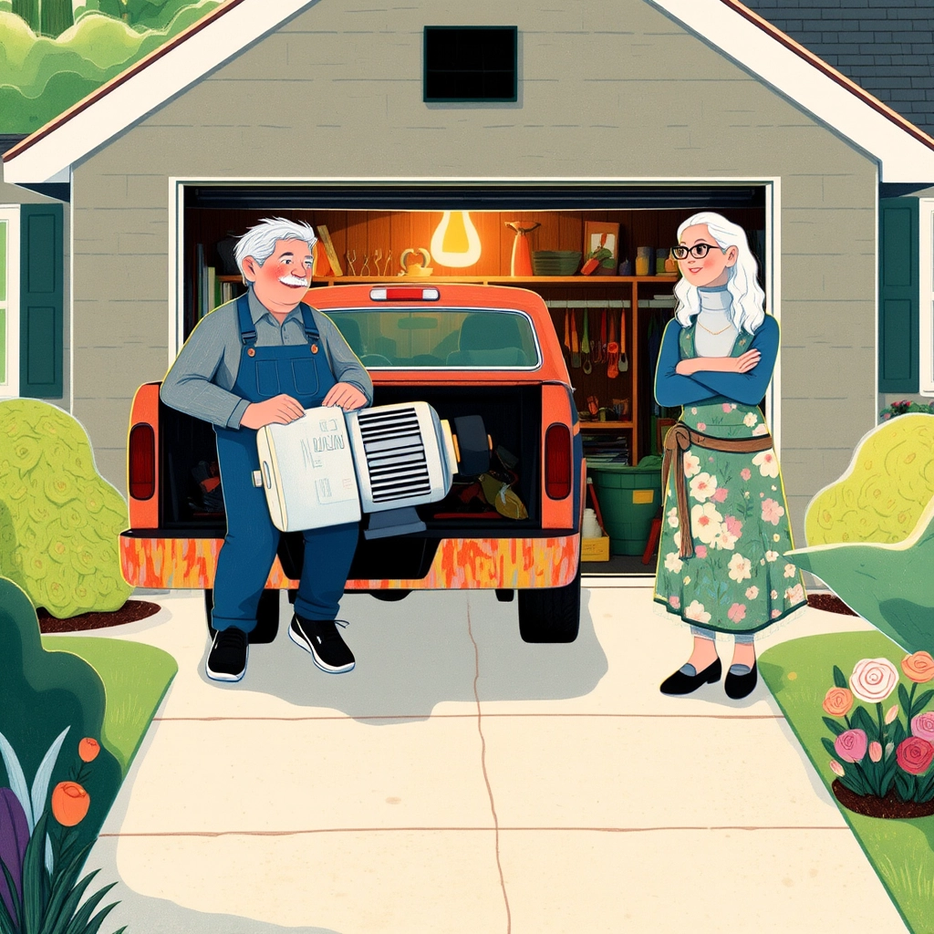 'What on earth is that?' [Carol](PR7VJ6HQ) asked. 'Oh, just a little retirement project,' [Rodd](JKWQ7DTK) replied as he precariously balanced the motor on a dolly. [Carol](PR7VJ6HQ) shook her head, already sensing trouble brewing.