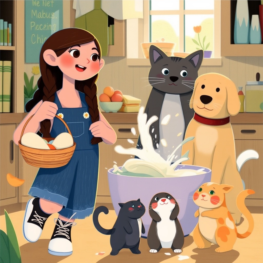 With [Max](5NSXTS34) fetching eggs, [Patches](TJ525K5R) licking up flour spills, and [Peanut](LHVQZNHD) holding a napkin in its tiny paws, it was a fun and messy experience in the kitchen!