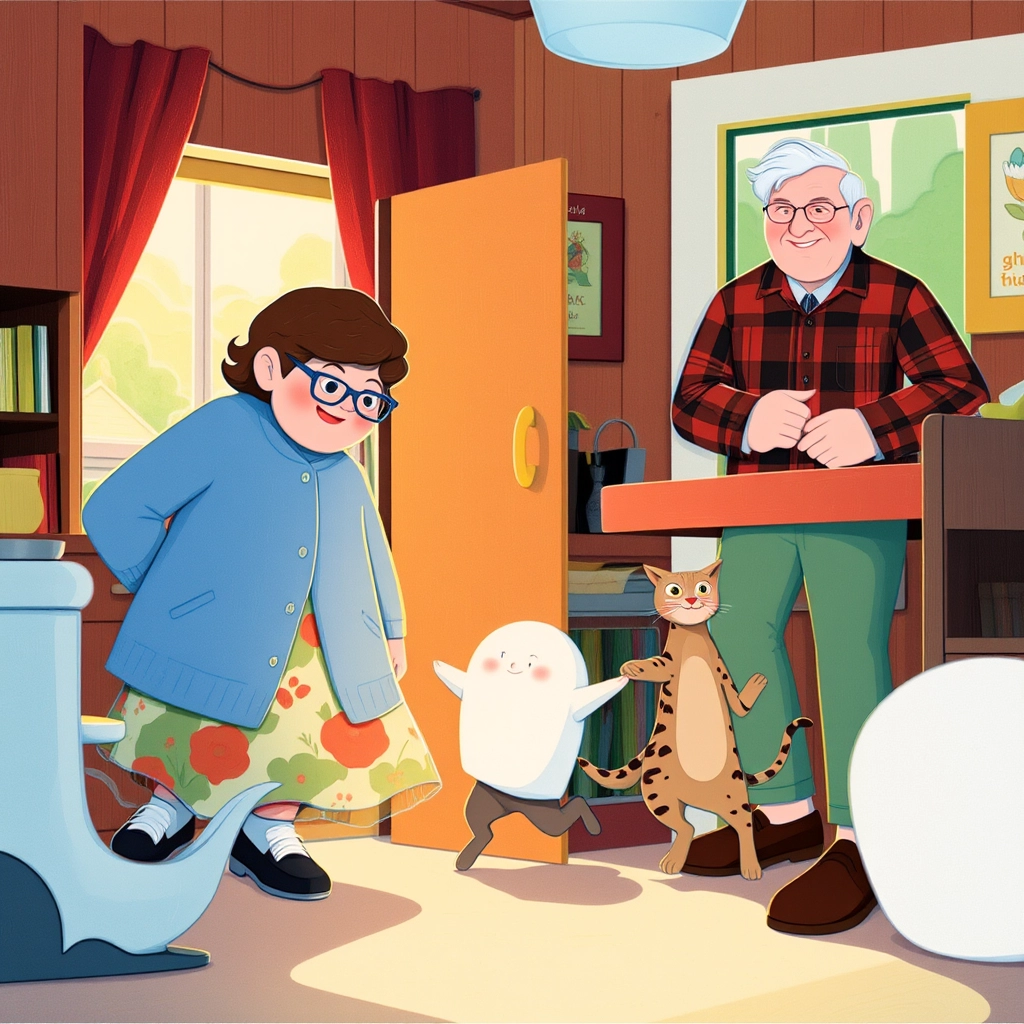 [Grammy](G2RY3GGV) bustled around the kitchen, humming her favorite tune, while [Gramps](4P6ZNGVX) sat on the porch reading the newspaper. Little did [Grammy](G2RY3GGV) know, the kittens were stealthily hiding, ready to spring out! [Ghost](WZMXRTV4) crept under the kitchen table, [Sootie](TVFBCHVY) stayed hidden behind a chair leg, and [Lynx](5GNY3X5M) flattened herself behind the curtain. "Boo!" they meowed, springing out all at once. [Grammy](G2RY3GGV) yelped, but [Gramps](4P6ZNGVX) just chuckled, ready as always.
