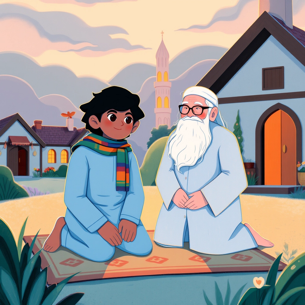 Once upon a time, in the small village of Noor Valley, lived a curious boy named [Ali](BZ6P7TZL). [Ali](BZ6P7TZL) loved to explore, play, and ask big questions about the world around him. One day, his beloved grandfather, [Baba Ibrahim](LHCGVPZT), invited him to learn about the five daily prayers in Islam.