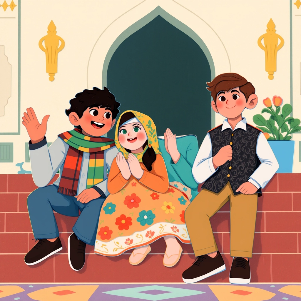 [Ali](BZ6P7TZL)'s friends, [Amina](NB3P5D9K) and [Kareem](J74JL4FP), joined him in prayers and they shared what they learned. 'Fajr is like planting seeds for the day,' [Amina](NB3P5D9K) said. 'And Maghrib is like a warm hug before bedtime,' added [Kareem](J74JL4FP). They all smiled.