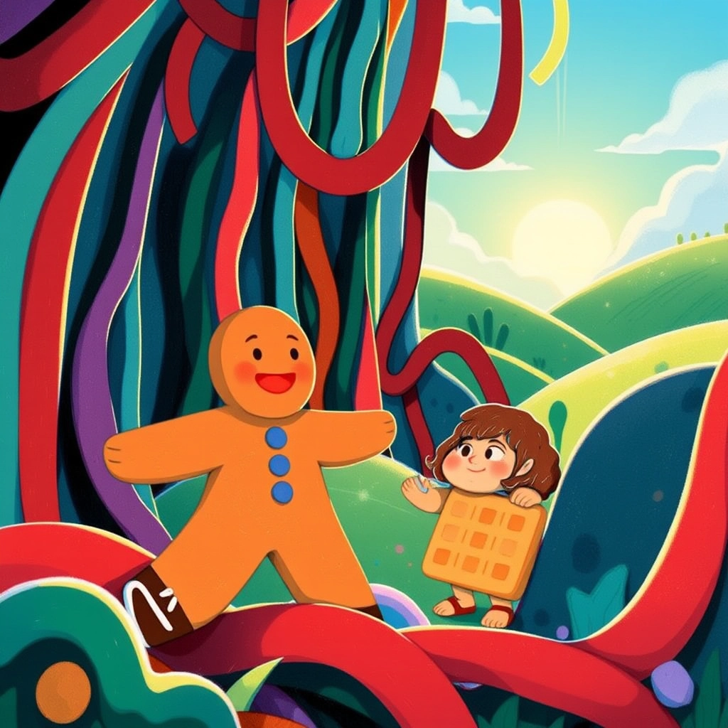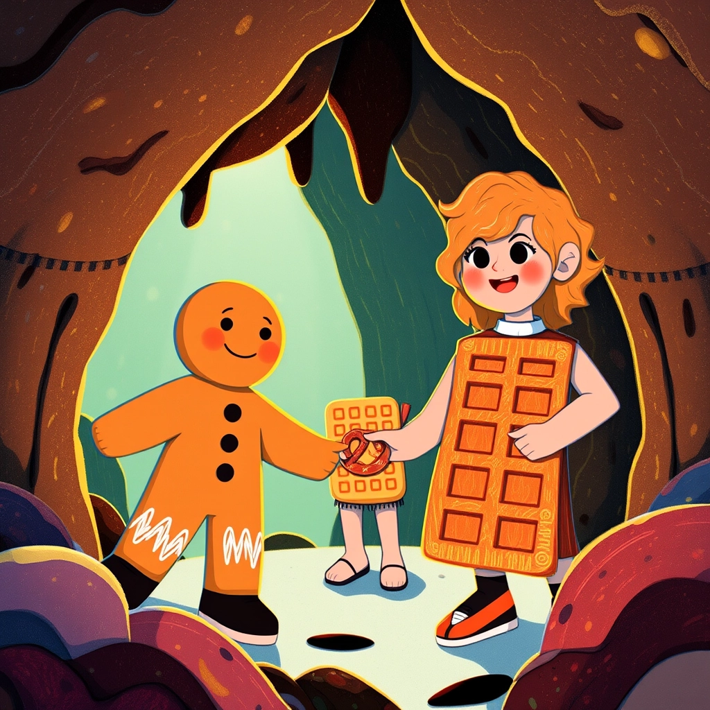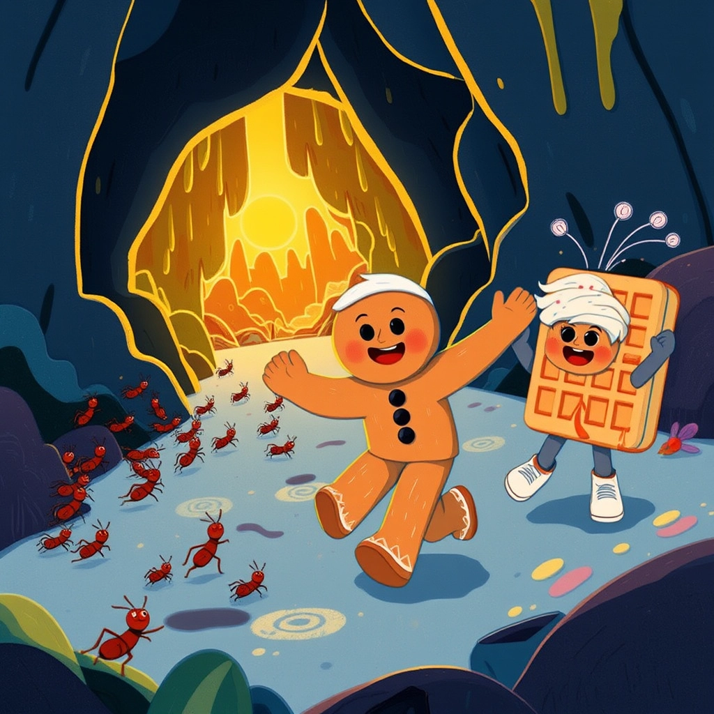 Together, they continued, but trouble was just around the corner—a group of icing-covered ants wanted to grab them! 'Quick! Follow me into the chocolate cave!' [Waffleton](TQLVZWCG) exclaimed.