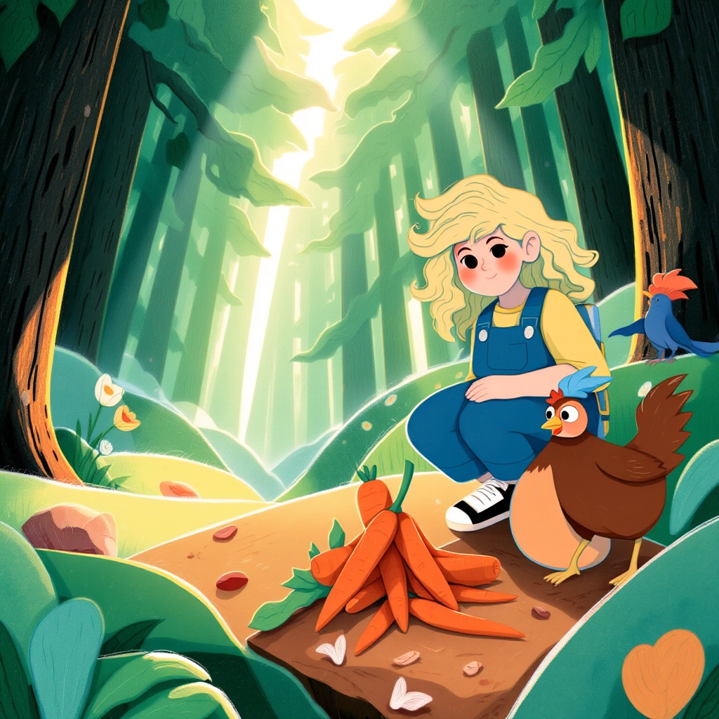 The team followed the footprints into the woods. They came upon a pile of half-eaten carrots. [Clucky](JYCHJD3R) clucked nervously. "It's like a carrot picnic!" giggled [Brooklyn](3S76RKHW), but her eyes searched the area for the thief.