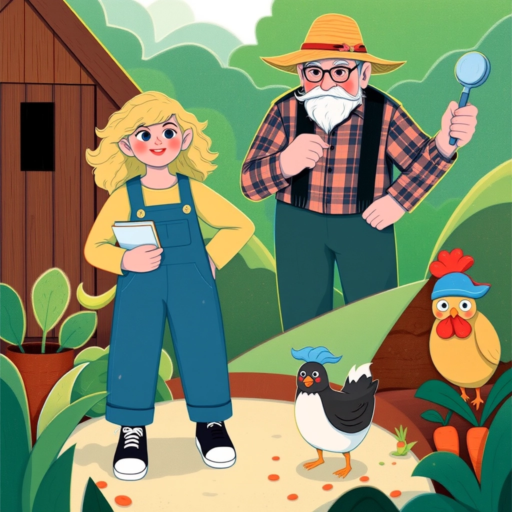 It was a sunny morning in the countryside, and [Brooklyn](3S76RKHW), with her curly blonde hair and big smile, was brushing [Clucky](JYCHJD3R), her fluffy ginger chicken, who proudly wore her blue hat. Nearby, [Cookie](C3R7ZCPZ) wagged his tail excitedly. Everything was perfect... until [Mr. Potter](LVPF3H43) stormed over from his vegetable garden shouting, "Someone stole my prize carrots!"