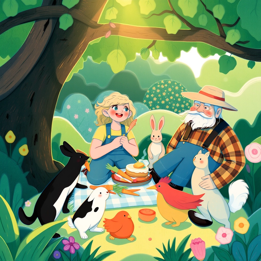 With the mystery solved, [Brooklyn](3S76RKHW), [Cookie](C3R7ZCPZ), [Clucky](JYCHJD3R), and their new bunny friends enjoyed a picnic in the garden. [Mr. Potter](LVPF3H43) even joined them with a slice of carrot cake!