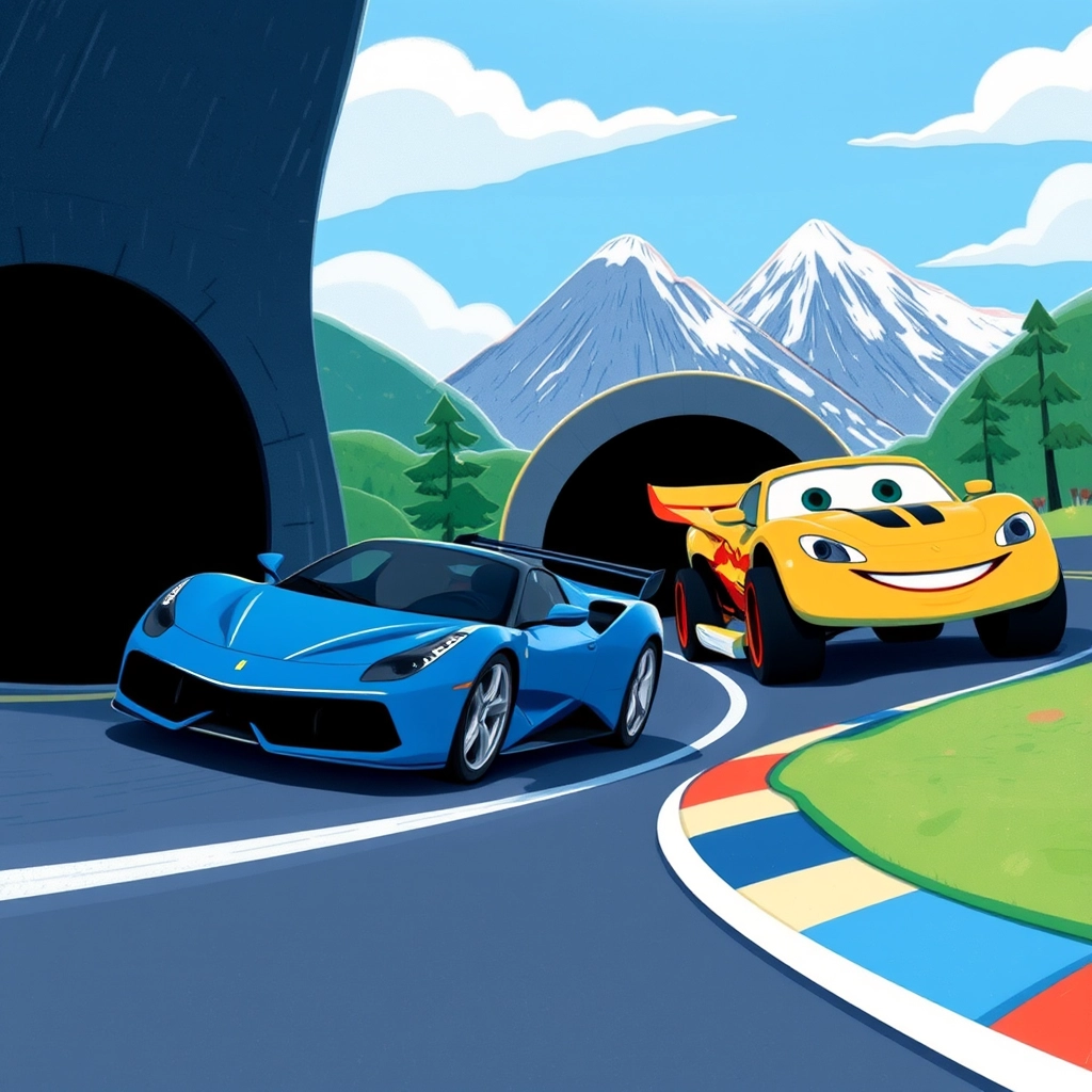 As the race began, [Speedy](75DWZSN3) surged ahead with his impeccable engine roaring, but [Blaze](LKKMGN9D) wasn't far behind. The two cars weaved through the first corner, neck and neck.