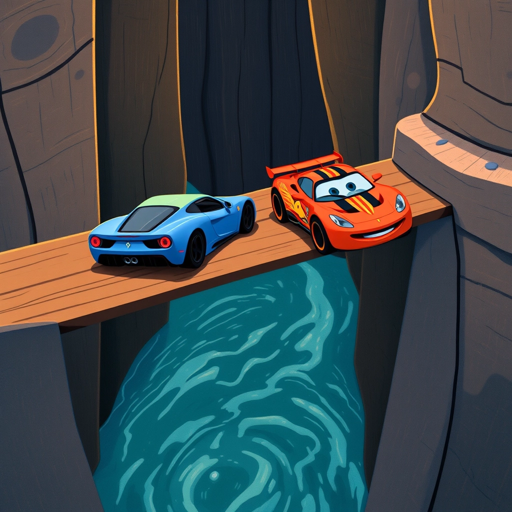[Blaze](LKKMGN9D) saw an opportunity on the bridge. He roared past [Speedy](75DWZSN3), leaving the blue Ferrari surprised for a moment—but [Speedy](75DWZSN3) quickly regained his focus.