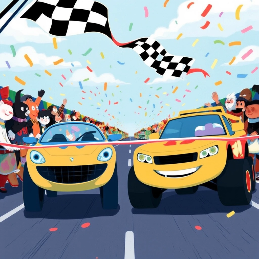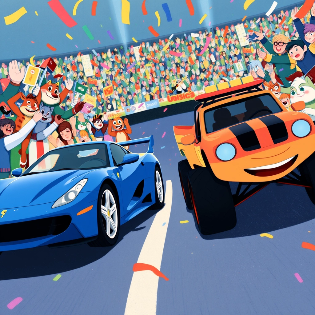 With one last burst, both [Speedy](75DWZSN3) and [Blaze](LKKMGN9D) crossed the finish line at the same time! Neither car could claim victory alone, and the crowd cheered louder than ever before.