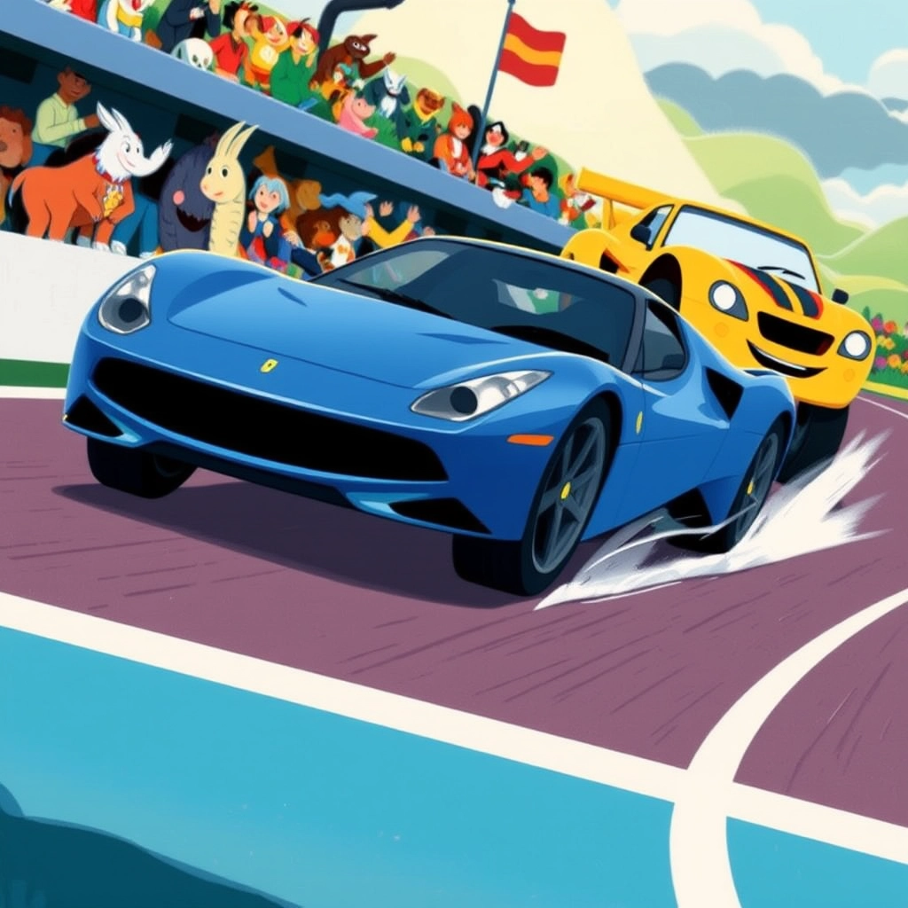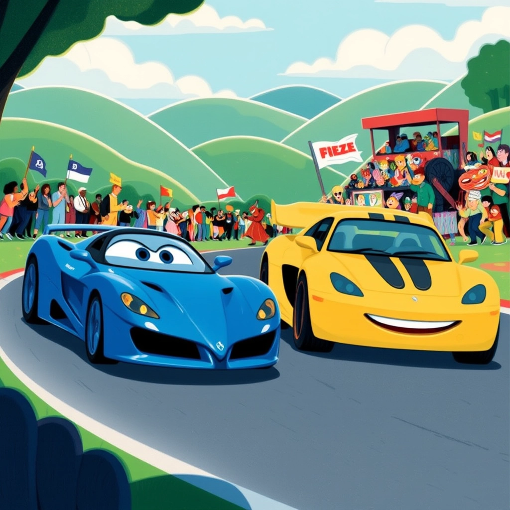 It was the day of the big race, and the crowd was buzzing with excitement. The competitors were all talking about the two most anticipated racers: [Speedy](75DWZSN3), the blue Ferrari, and [Blaze](LKKMGN9D), the yellow RX-5.