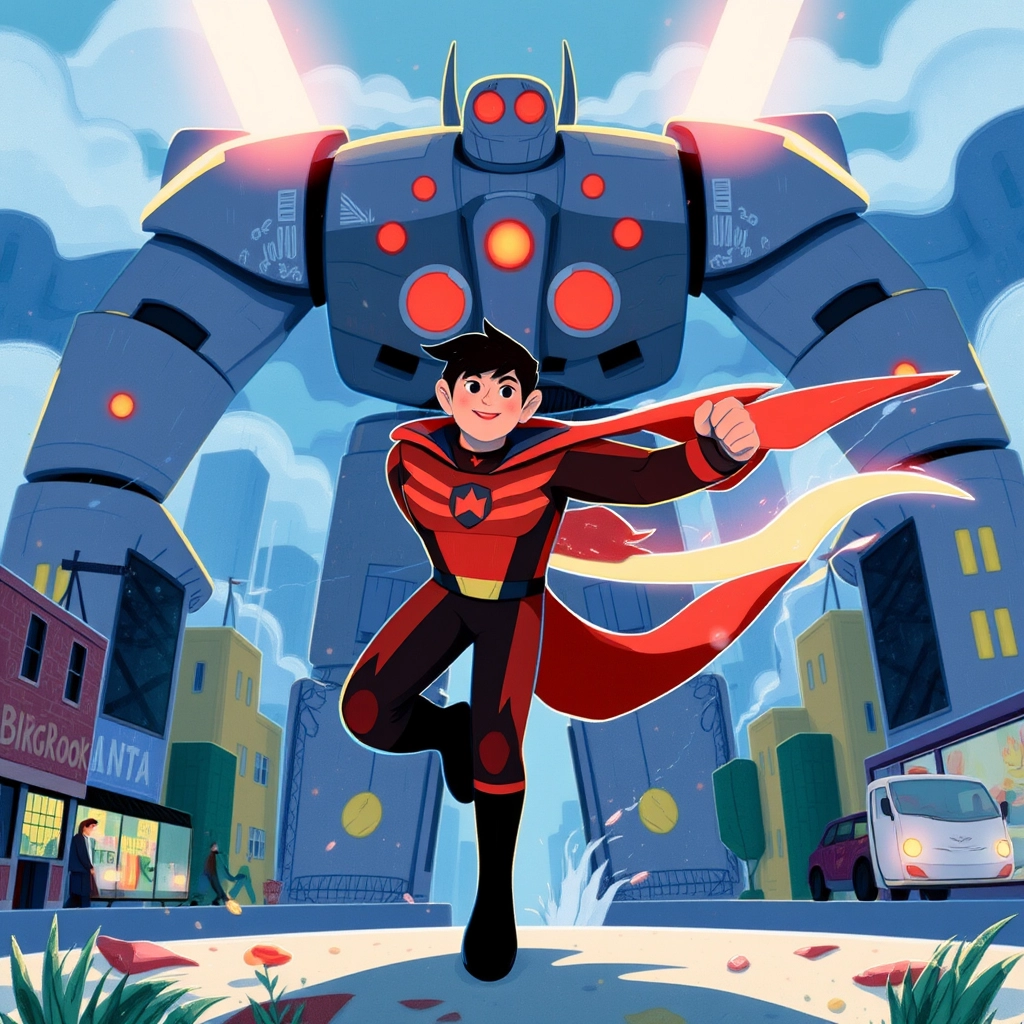 It was a giant robot, stomping and causing chaos! [G-swift](29PC2W3W) leapt into action, his fists glowing with vibrant energy as he charged toward the mechanical menace.