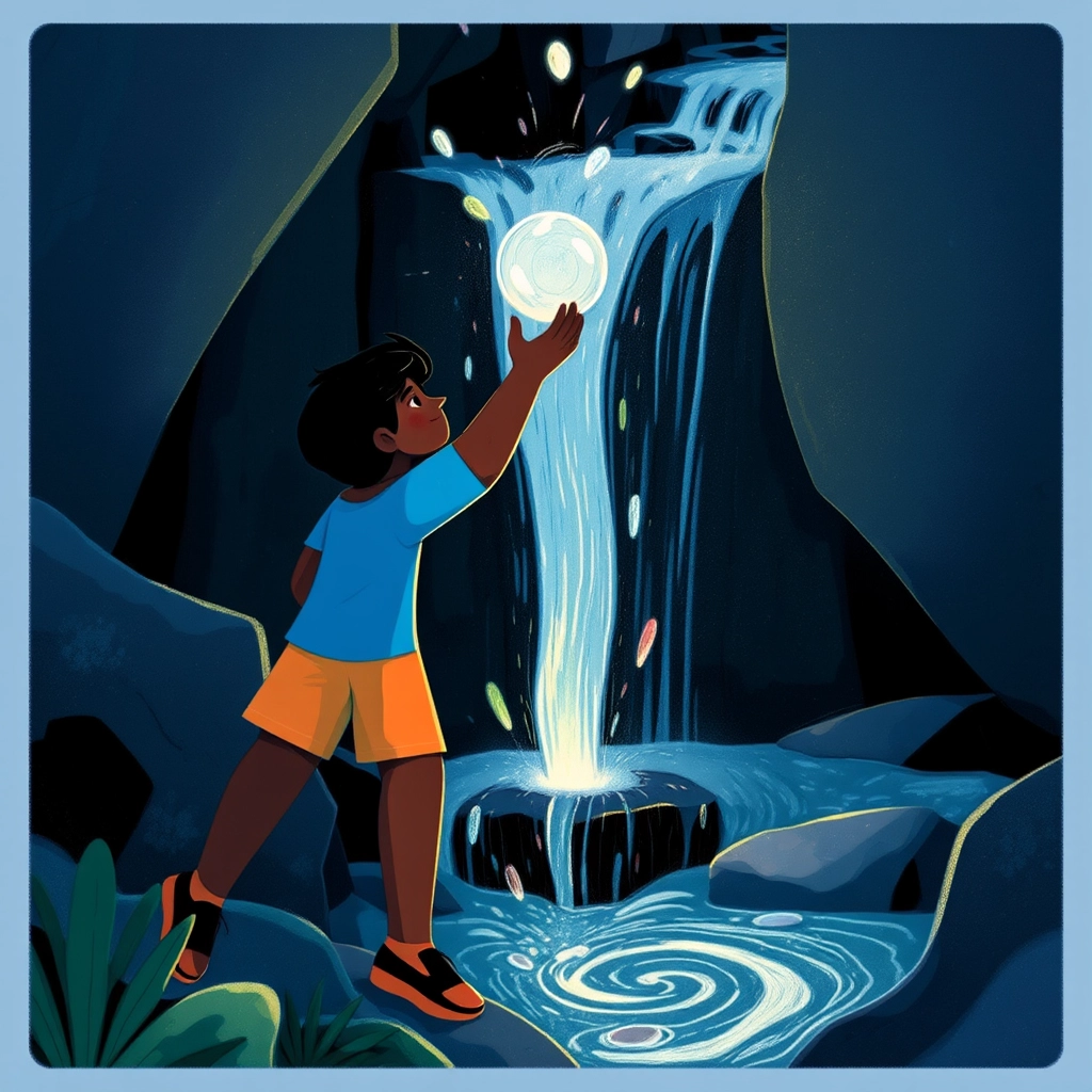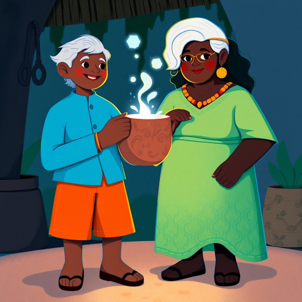 [Jidem](9VQM6H4G), a curious 10-year-old boy clad in a sky-blue shirt and orange shorts, was on his way to fetch water from the Ibagu stream for his [Grandma](JG4D3LWQ). He walked through a narrow, forested path, his clay pot in hand, when something sparkled on the ground.