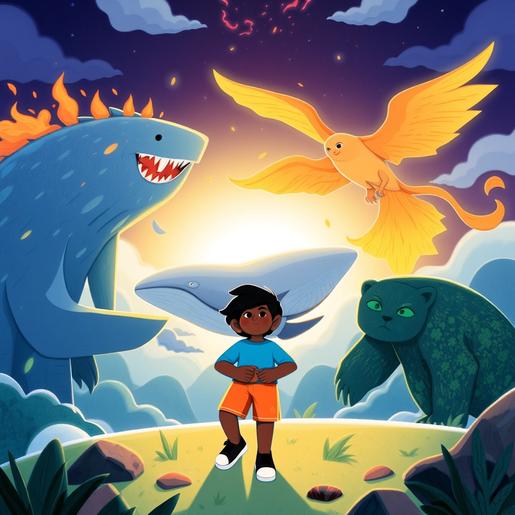 Soon, he found himself face-to-face with four majestic beasts—the Lion of Fire, the Eagle of Wind, the Whale of the Depths, and the Bear of Earth. Their voices boomed in unison, 'Why are you here?' [Jidem](9VQM6H4G) nervously replied, 'You sent for me! Our land is sick, and we need healing.'