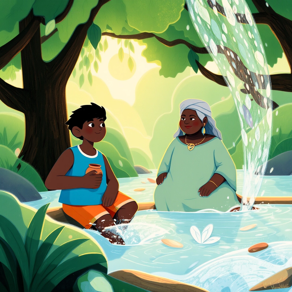 Hurrying back home with the glistening water, [Jidem](9VQM6H4G) reached [Grandma](JG4D3LWQ), who immediately noticed the water's brilliance and exclaimed with wonder, 'This is no ordinary stream water, my boy!' The magic of the water brought her energy and health back instantly.