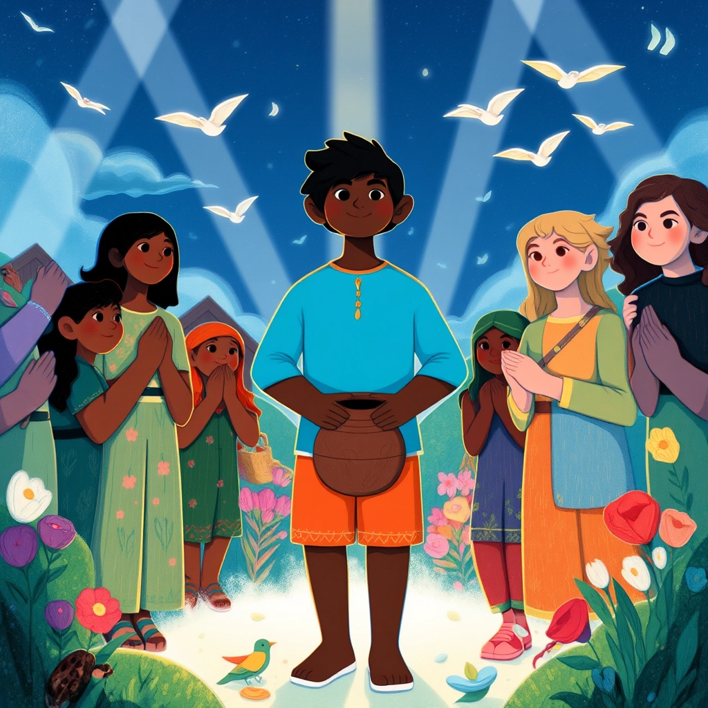 As the villagers gathered to see the miraculous water, they felt an odd energy in the air. The wind quickened, and the earth pulsed as forgotten rivers and plants came back to life. The villagers, holding hands, sang in joy and gratitude.