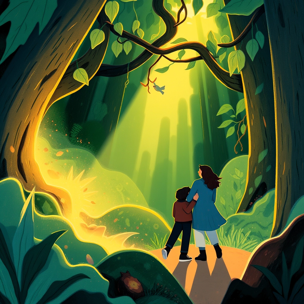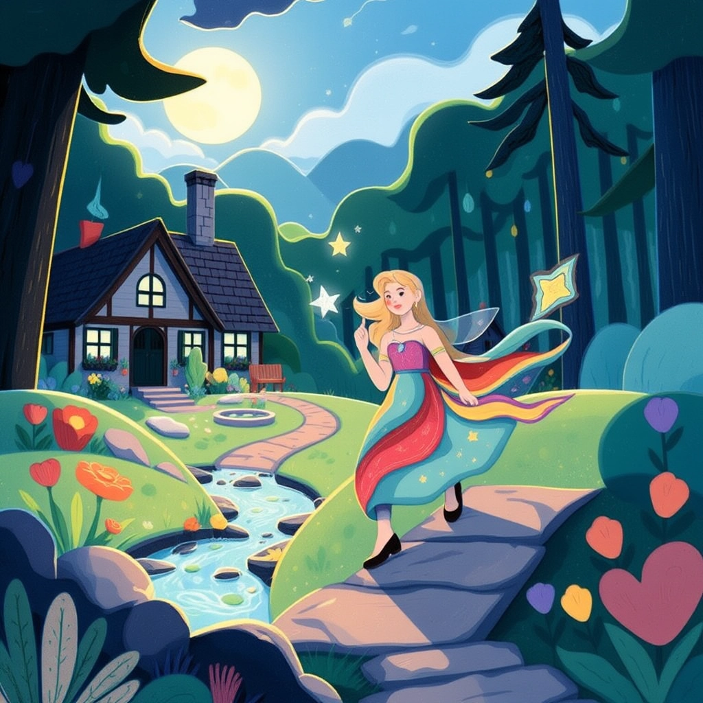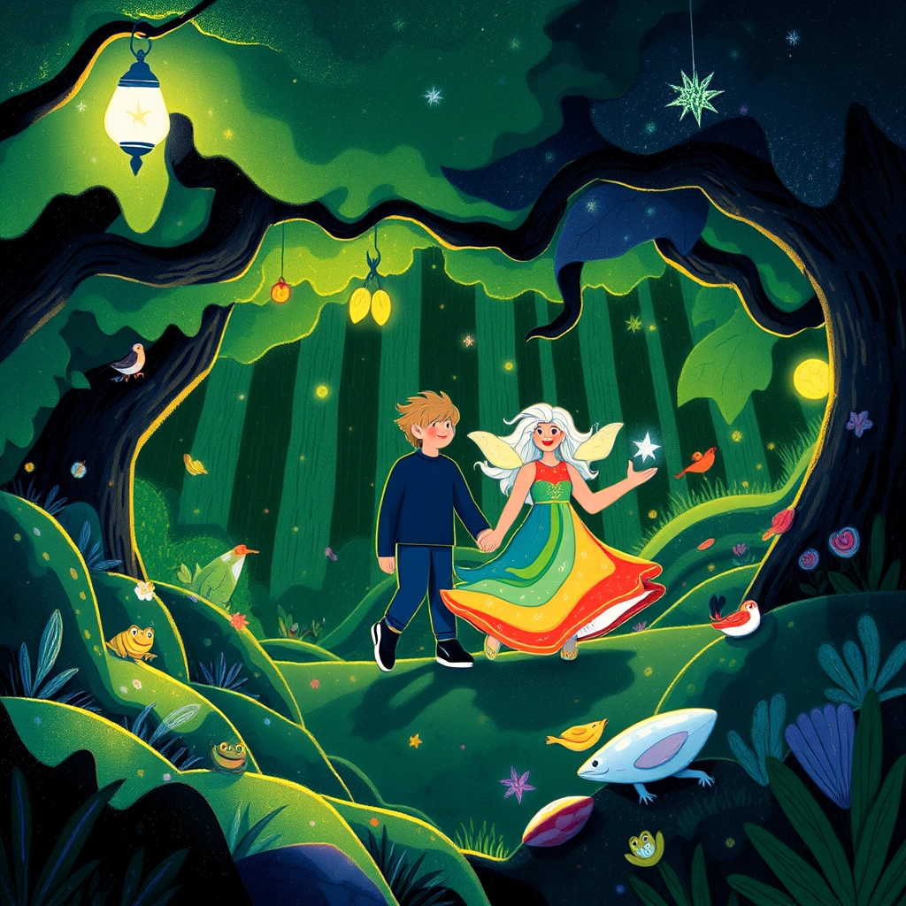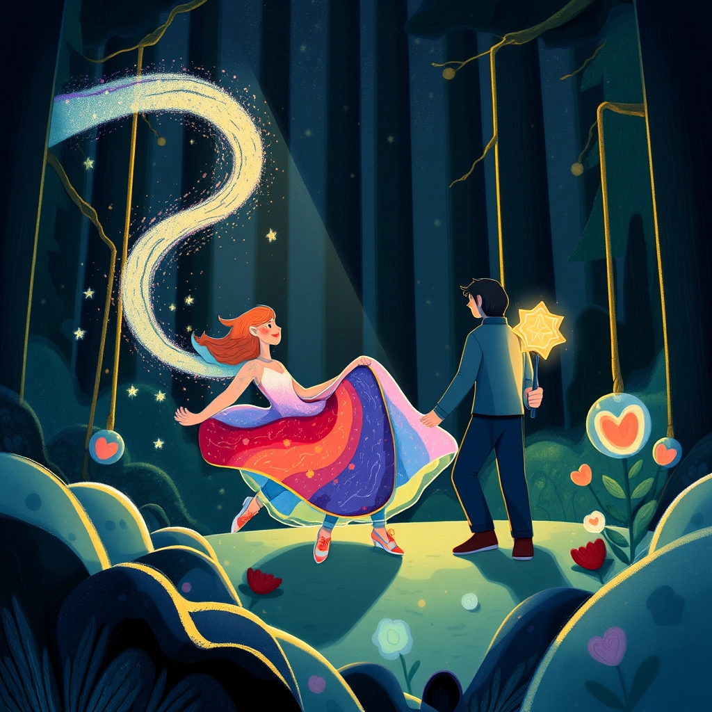 Together, the couple began along the glowing trail. They encountered puzzles to solve, carrying stones over streams, and helping trapped birds find freedom. Each challenge proved their teamwork and love grew stronger with every step.