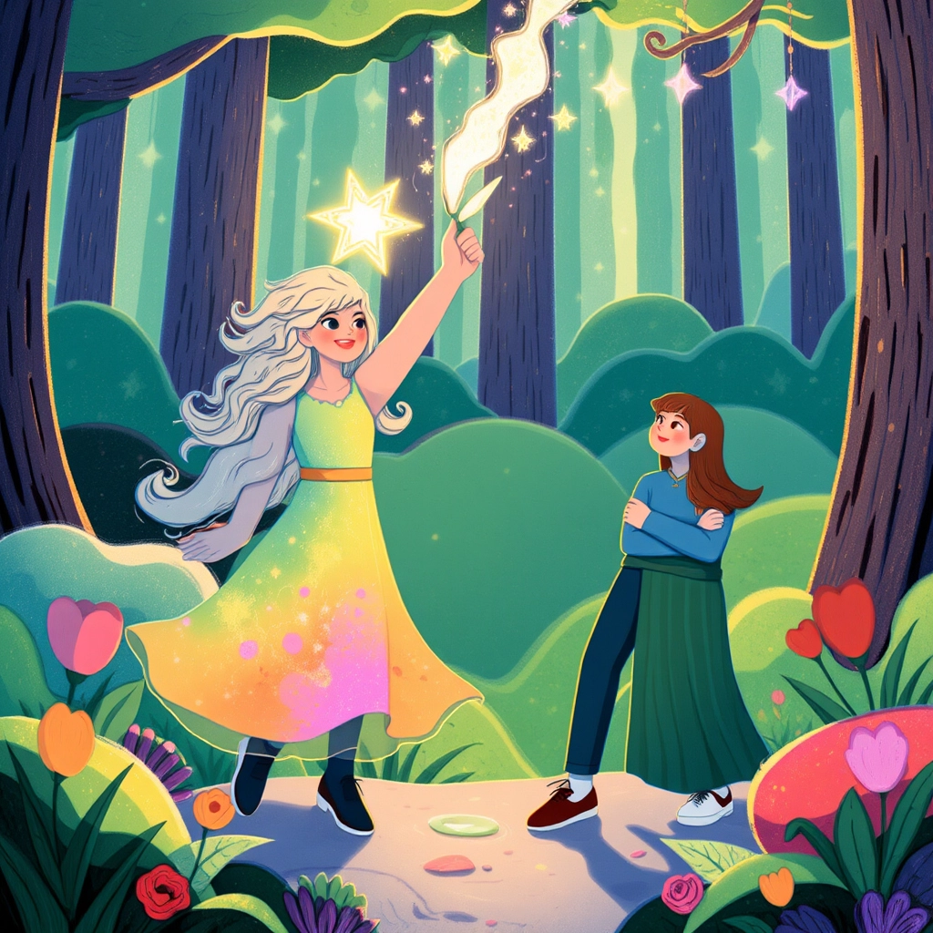 Soon they reached a clearing where glowing mushrooms formed a perfect circle, and in its center, dancing like a joyful swan, was [Hedgy](HXF2PXMZ). Her moonbeam hair shimmered, her skirt of kaleidoscope colors spun, and her starry eyes seemed to hold the universe.