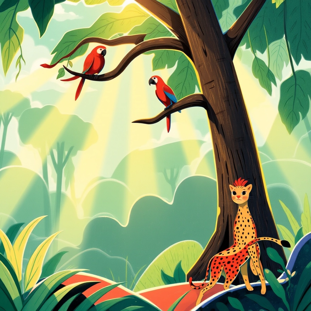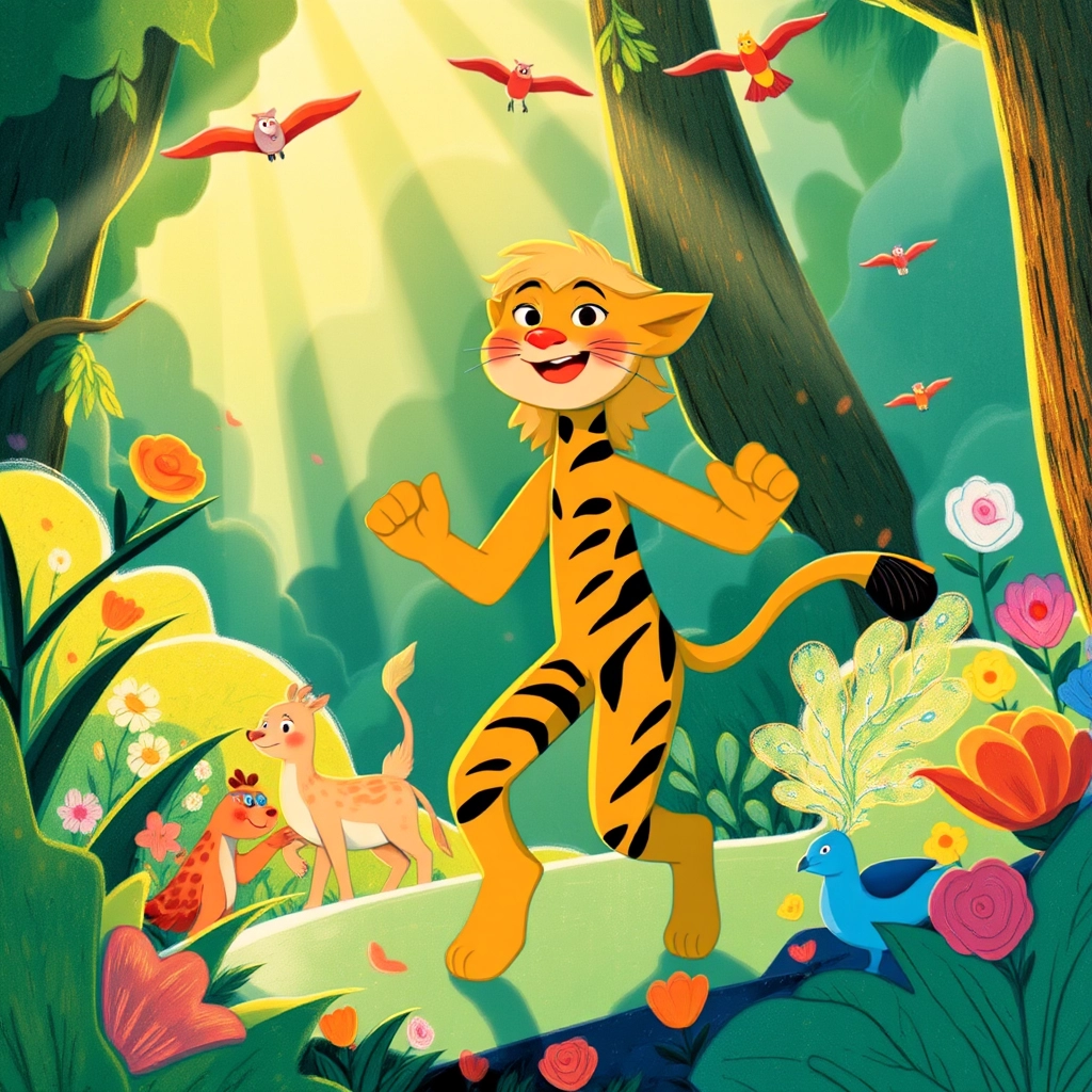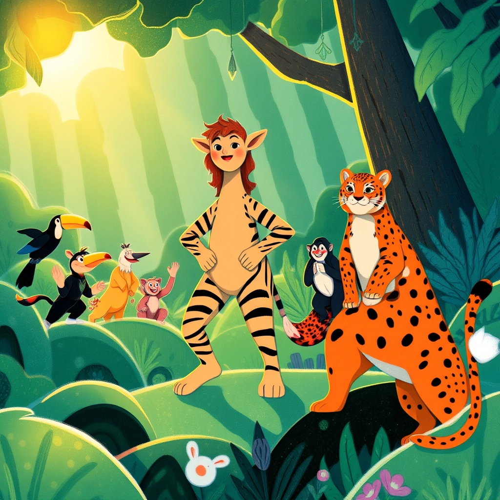 In the heart of a dense, green jungle filled with chattering birds and blooming flowers, there lived a very unusual animal named [Zippy](XBSZWXWV). [Zippy](XBSZWXWV) was unlike any other jungle creature, with lion paws, a giraffe's long neck, zebra stripes, and a peacock's tail. But [Zippy](XBSZWXWV) was unhappy with his mixed-up look.