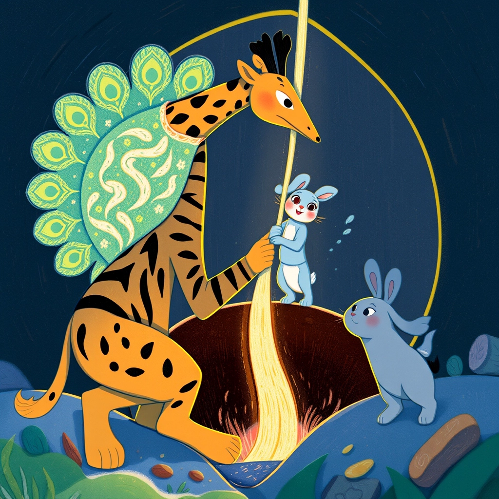[Zippy](XBSZWXWV) thought quickly. Using his peacock tail, he reached into the hole, and [Ricky](9T4RXZM9) jumped onto the colorful feathers. With a mighty pull of his lion paws and strong legs, [Zippy](XBSZWXWV) hoisted [Ricky](9T4RXZM9) out of the hole safely.