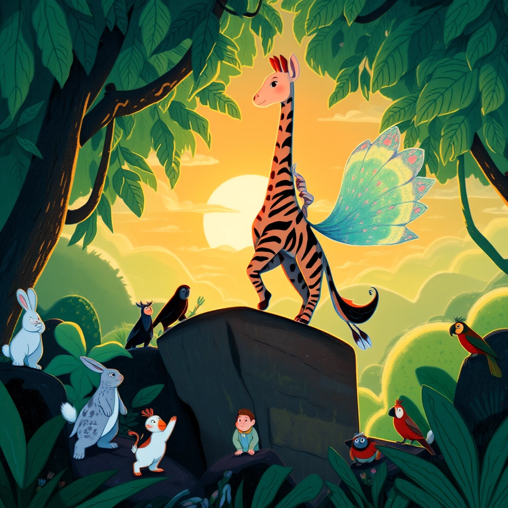 The jungle never forgot [Zippy](XBSZWXWV)’s bravery that day. And [Zippy](XBSZWXWV)? Well, he was finally happy being exactly who he was—the jungle hero with a peacock tail, zebra stripes, a giraffe neck, and lion paws!